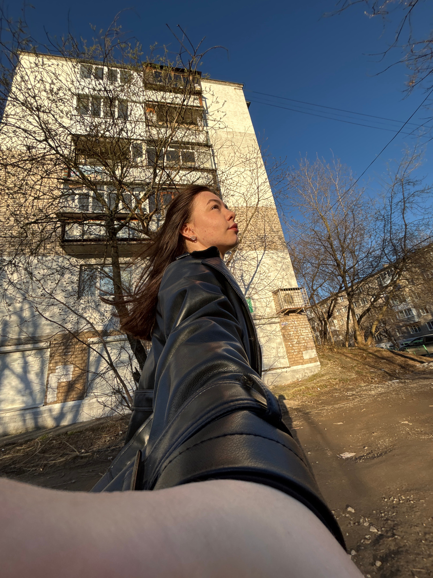 The photograph is an outdoor shot taken in Perm, Russia. The focus is on a woman with long brown hair, wearing a black leather jacket. She is positioned in the foreground, facing upwards and towards t…read more