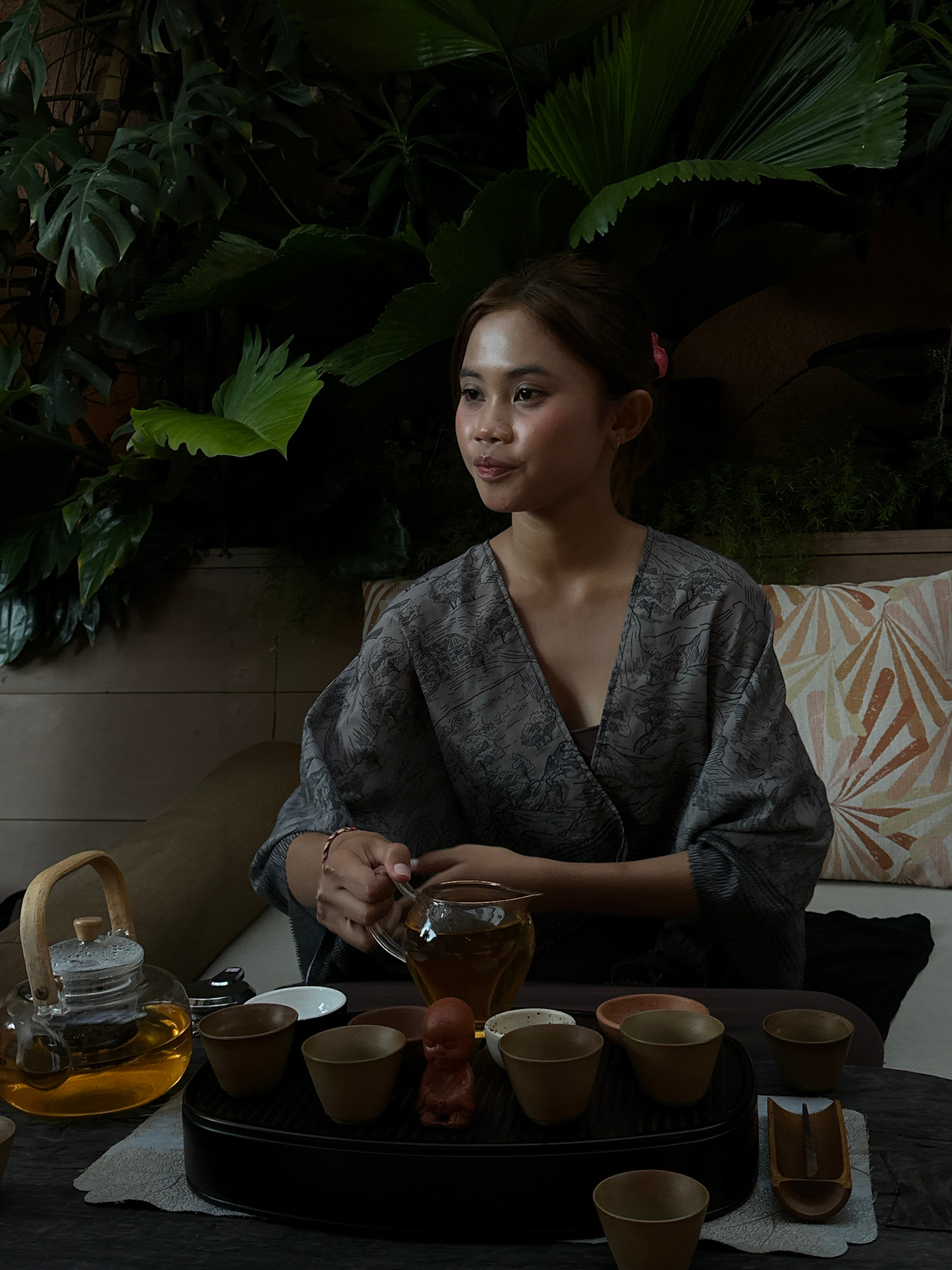 A young woman with long brown hair and fair skin, wearing a grey patterned kimono-style top, pours tea from a glass pitcher into a small cup. She is positioned beside a dark wooden table containing a…read more
