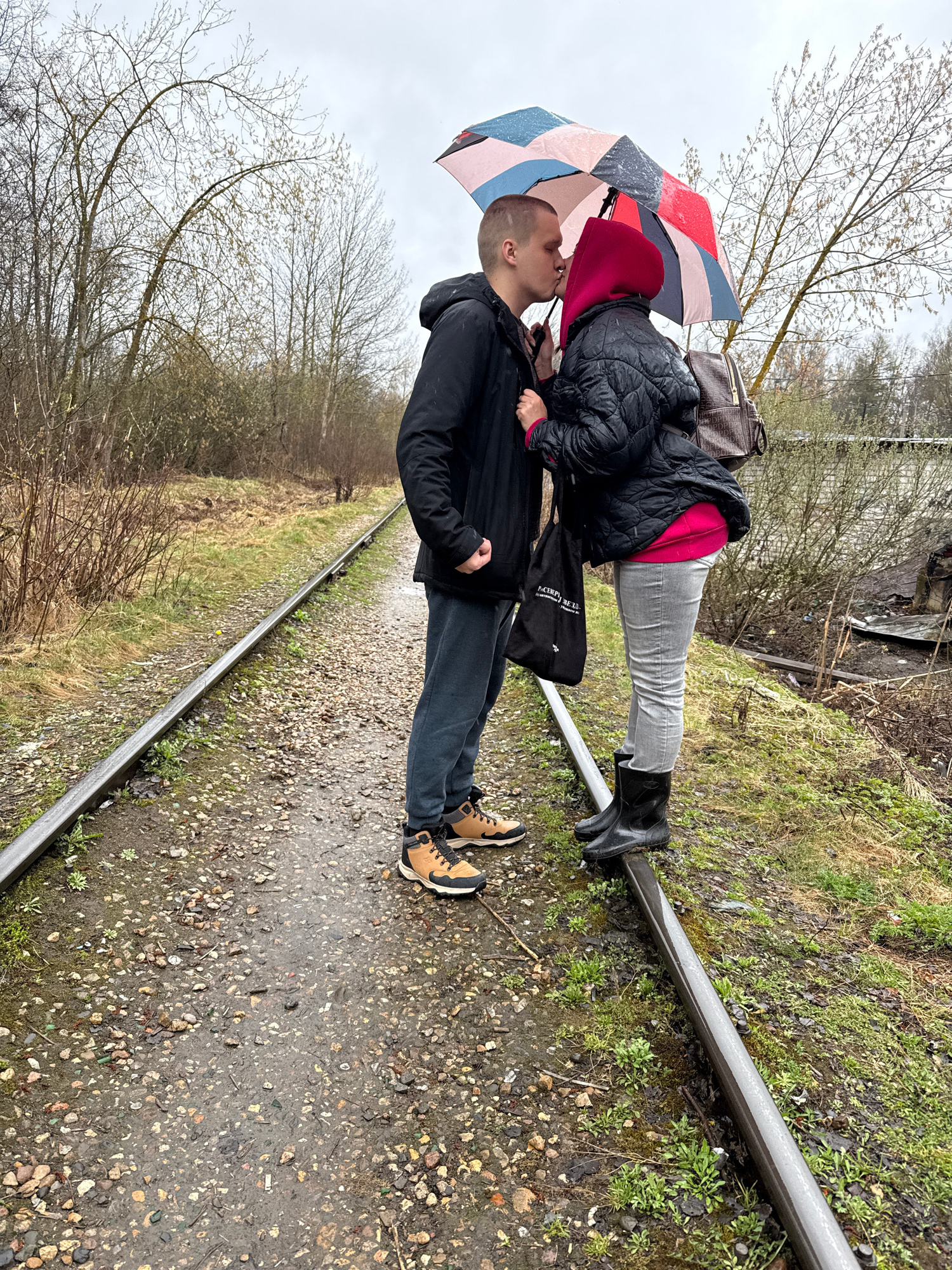The image depicts two individuals, a man and a woman, sharing a tender moment outdoors, appearing to kiss or lean in for a kiss under a multi-colored umbrella. The man, seen from his left profile, has…read more