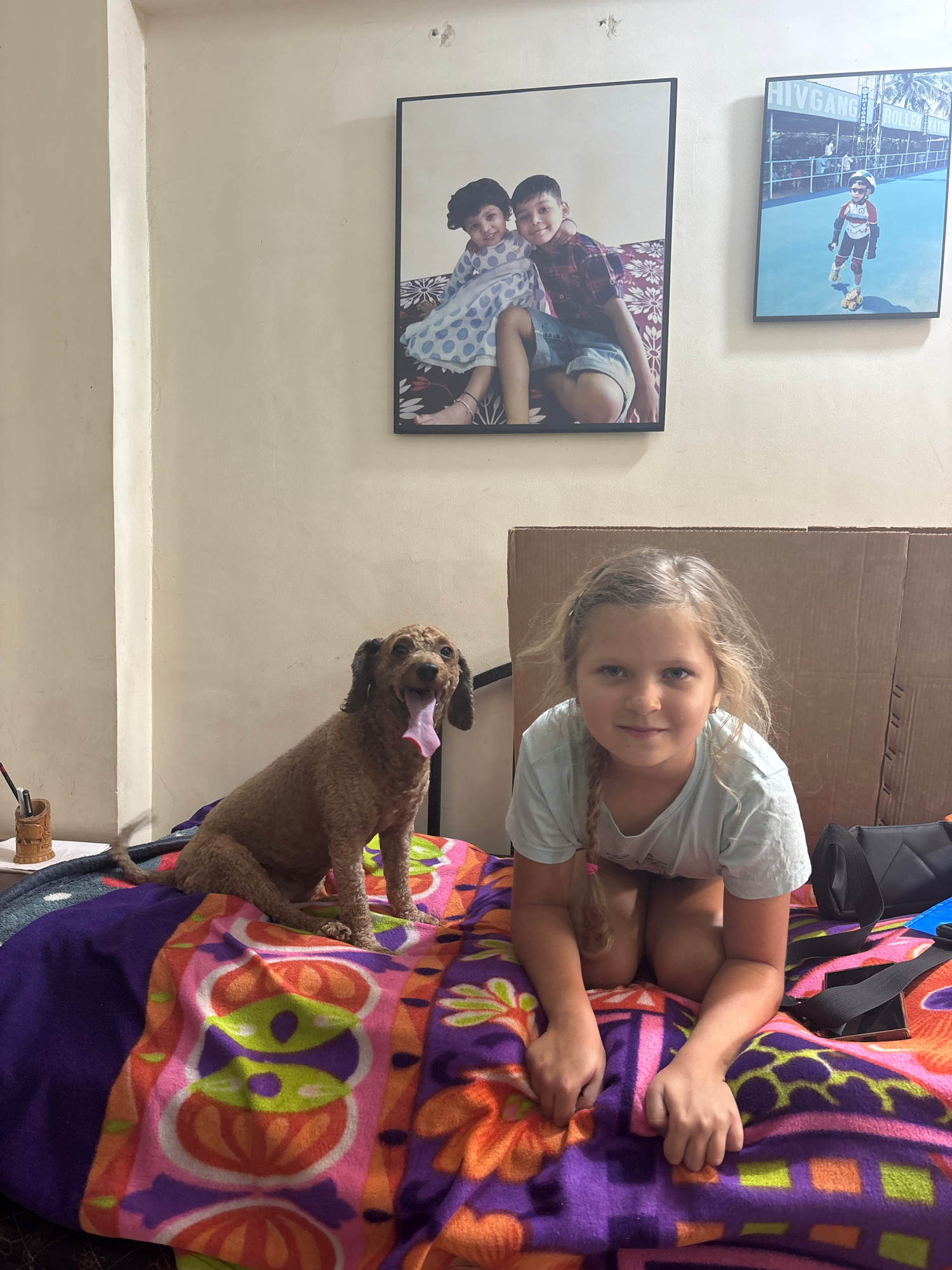 A young girl with blonde hair in pigtails is on a blanket with orange, pink, and purple patterns. A brown poodle with its tongue out stands next to her. Behind the girl, there is a brown cardboard box…read more