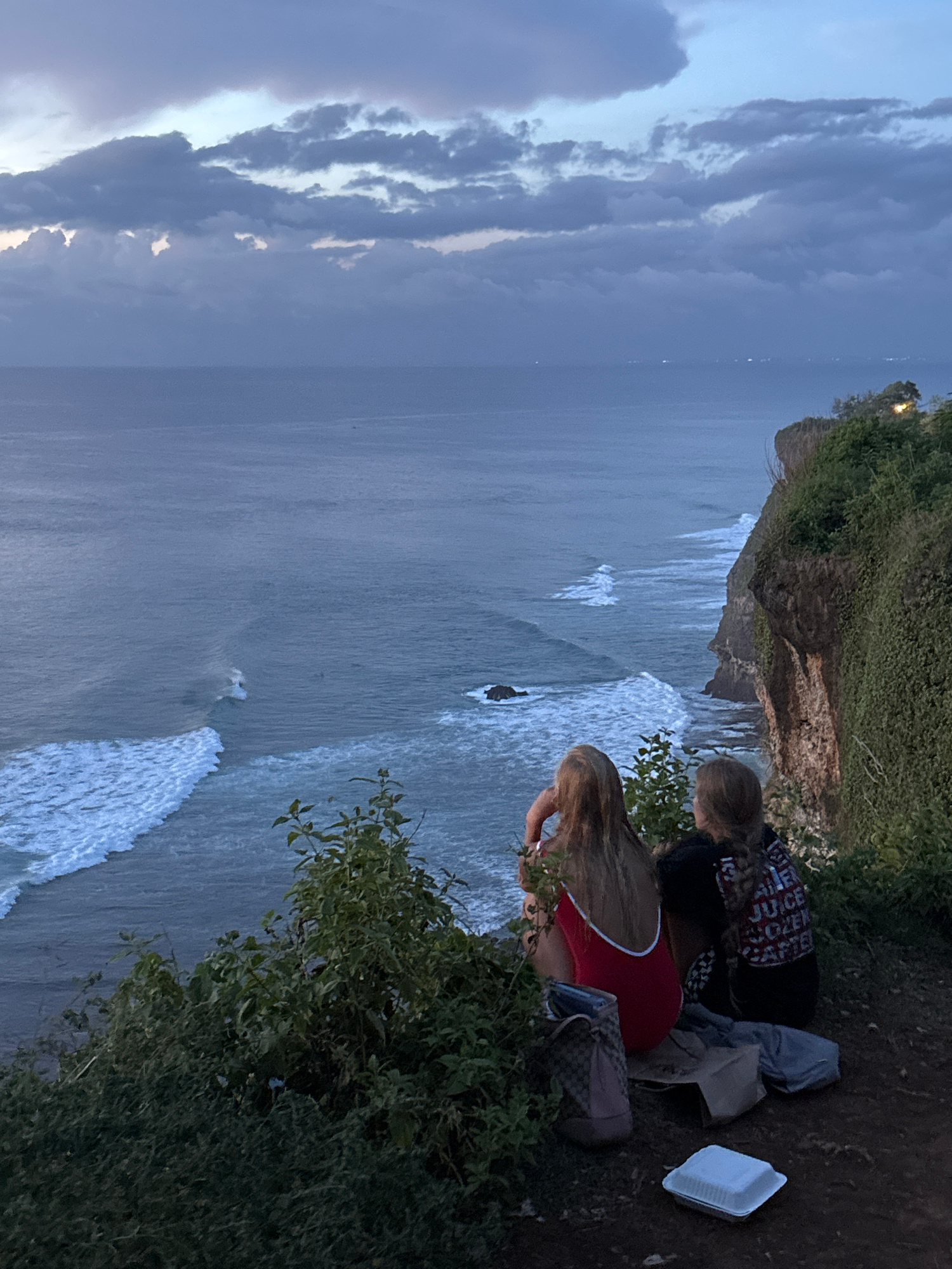 Two individuals are sitting on a cliff edge overlooking the ocean. The cliff is covered with vegetation. One person is wearing a black shirt with words printed on it, and the other is wearing a red to…read more