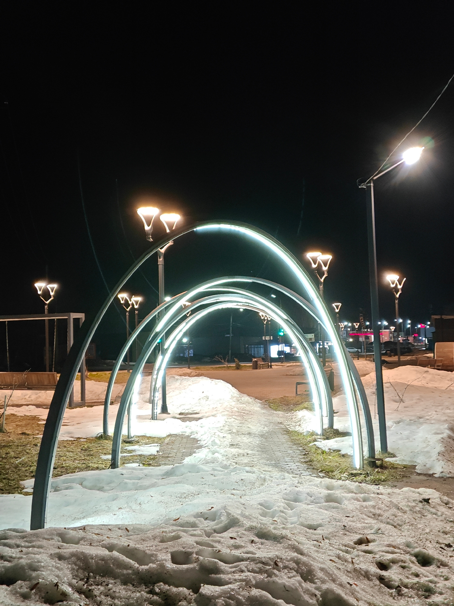 The image depicts an illuminated pedestrian walkway at night in what appears to be a park or public space. The location is likely in Chaikovsky, Russia, based on visual characteristics typical of Russian urban landscapes. The walkway is defined by a series of arching metal structures, each lined with a light source, creating a tunnel effect. The ground on either side of the walkway is covered in snow, with patches of grass visible where the snow has melted. The walkway itself is paved, with some snow and ice present. In the background, streetlights illuminate a street with buildings and vehicles. The overall lighting suggests it is nighttime. There are no people clearly visible in the image. Other details visible in the image include standard streetlight poles, a swing set, and benches. | Open Wire