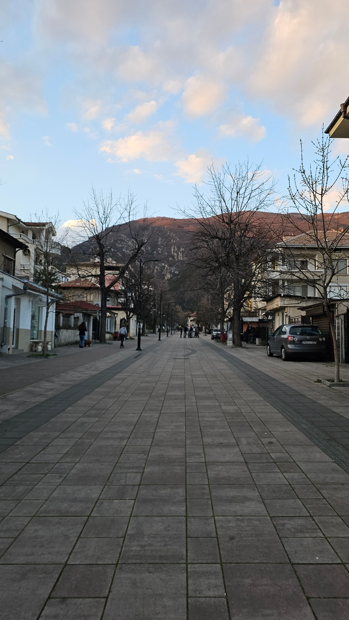 The image depicts a street scene in Karlovo, Bulgaria. The perspective is looking down a paved pedestrian walkway, characterized by a grid pattern of concrete pavers and bordered by a darker strip alo…read more