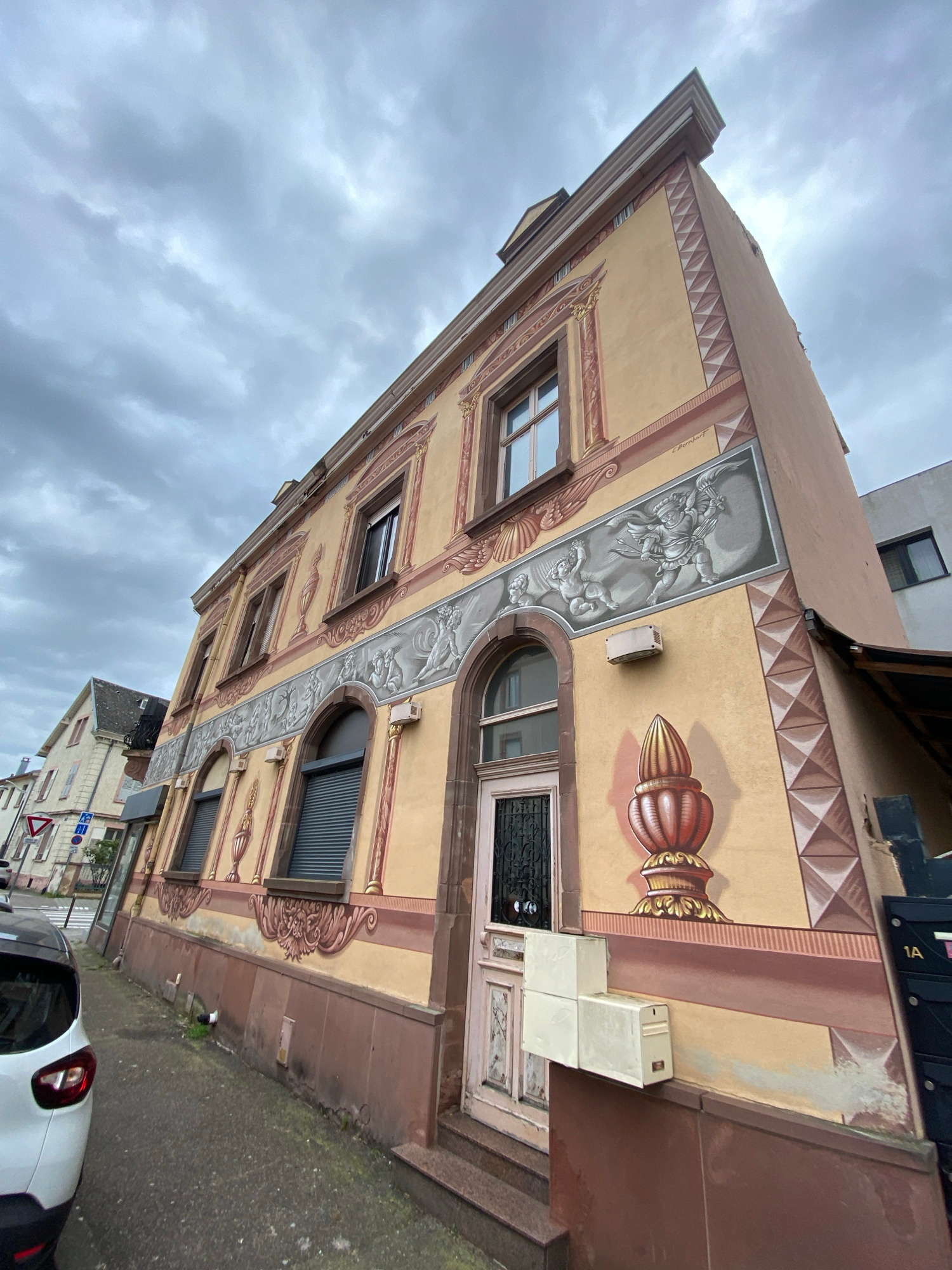 The image shows a building in Bischheim, France, characterized by painted exterior decorations. The building has a tan facade with architectural details highlighted in brown and gray, including a painβ¦read more