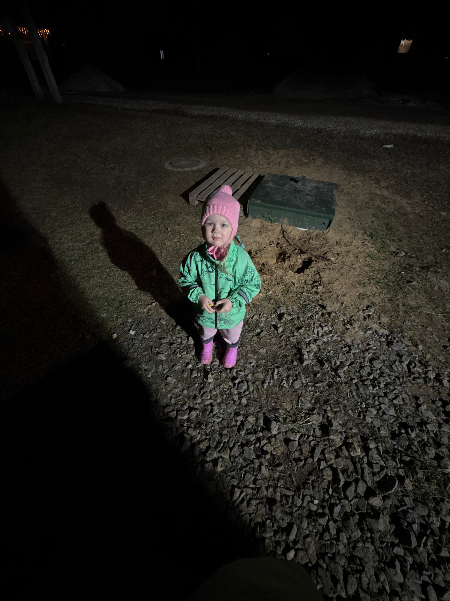 A young child wearing a pink hat, light green jacket with a pattern, light pink pants, and pink boots is standing in a grassy, muddy area next to a patch of rocks, with a green box nearby. The locatio…read more