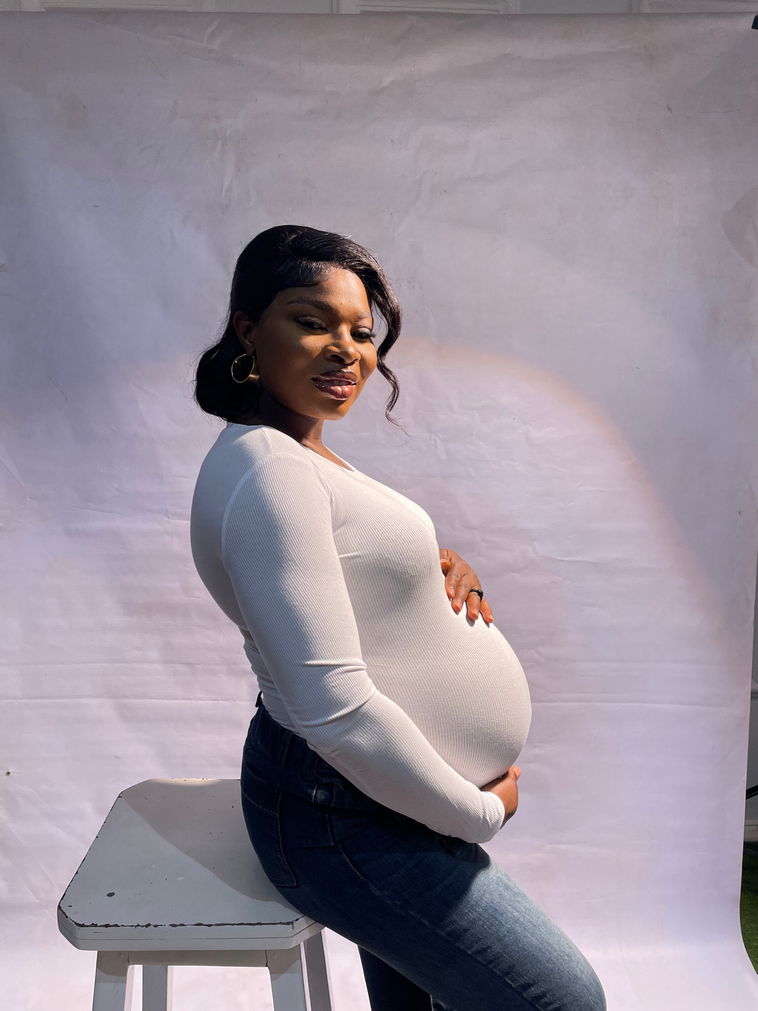 A pregnant woman with brown skin and long dark hair, wearing a white long-sleeved shirt and blue jeans, is seated on a white chair against a white backdrop. The woman is looking at the camera and hold…read more