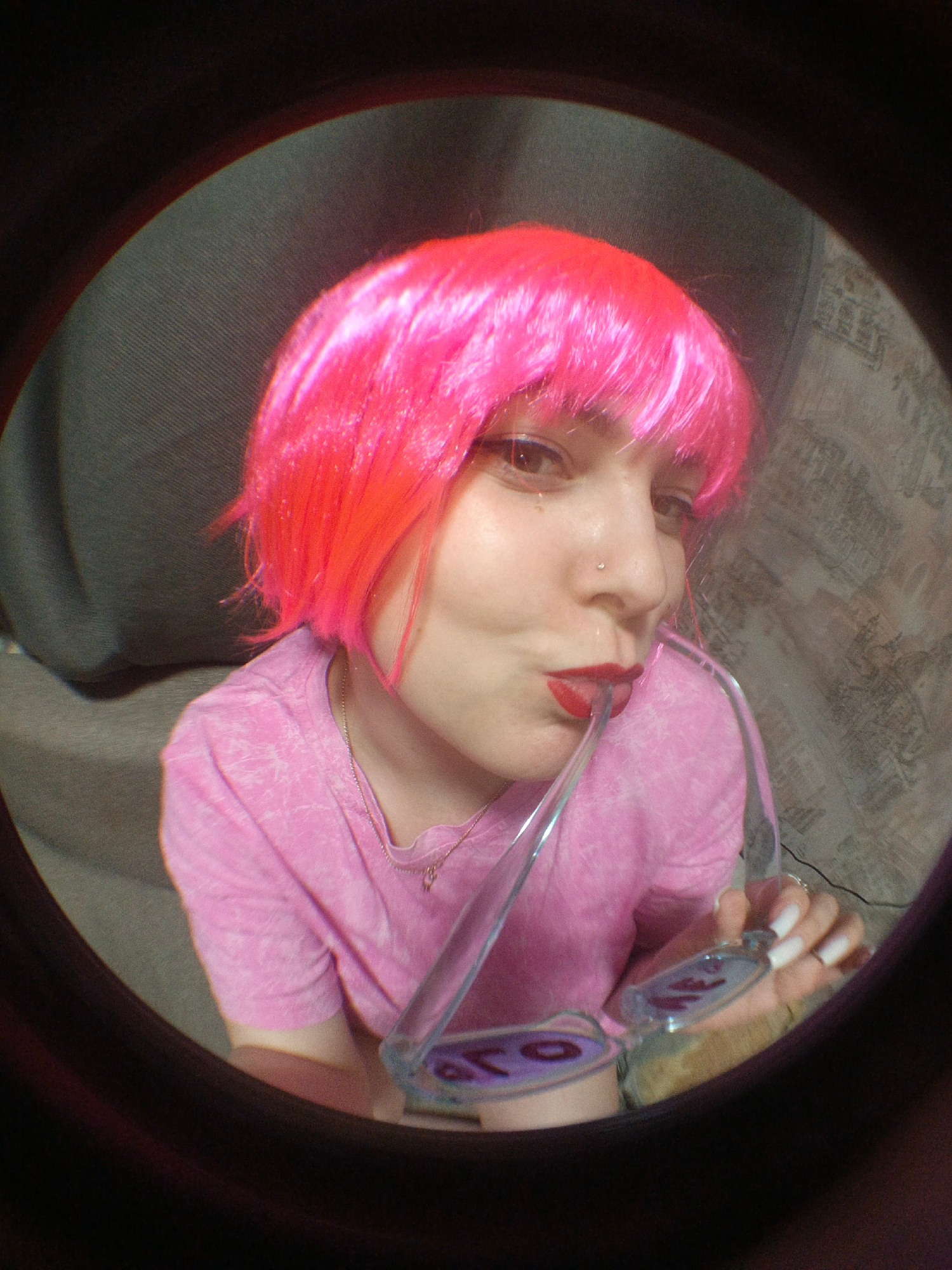A person with light skin, a nose piercing, red lipstick, and a short, bright pink wig is depicted in a fisheye lens photograph. They are wearing a pink t-shirt and holding a pair of transparent sungla…read more