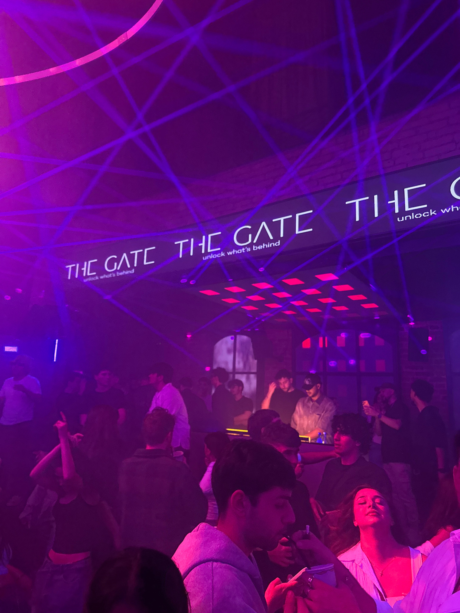 The image depicts the interior of The Gate nightclub in Yerevan, Armenia. The scene is illuminated by intense purple and pink lighting, with multiple laser beams crisscrossing the upper space. A promi…read more