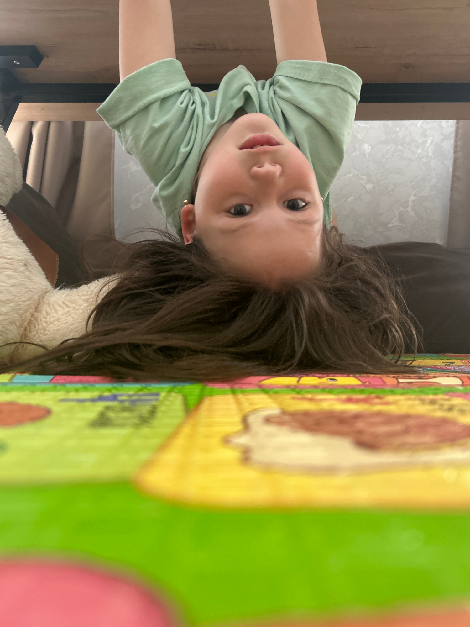 A young girl with long brown hair is looking at the camera, upside down. Her head is positioned over a colorful children's play mat with various images on it. She is wearing a light green T-shirt. A p…read more