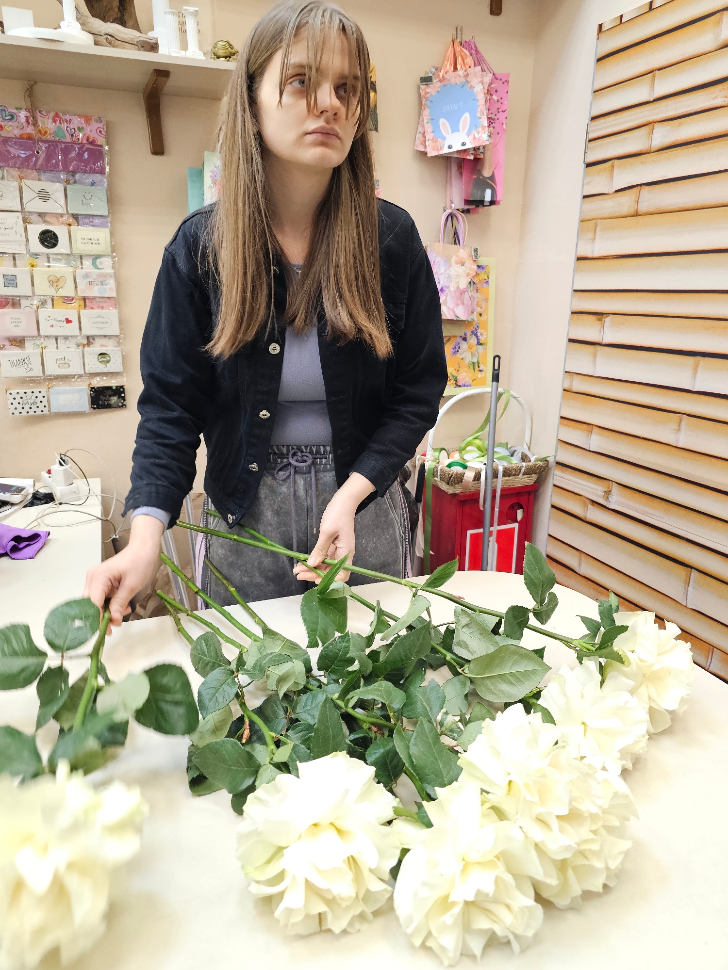 The image, which appears to be rotated 90 degrees counter-clockwise, depicts a young woman in an indoor setting, likely a flower or gift shop in Khimki, Russia. She has long, straight brown hair with…read more