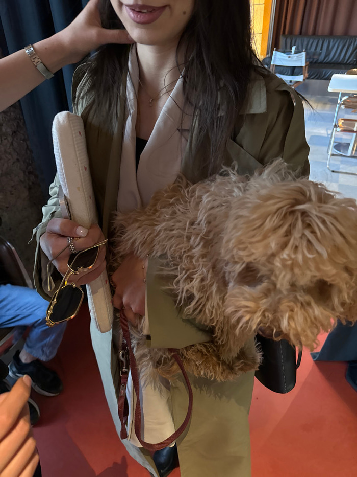 The scene is an indoor establishment in Yerevan, Armenia. A female individual, partially visible, with long, dark hair and wearing an olive-green trench coat over a white garment and light-colored tro…read more