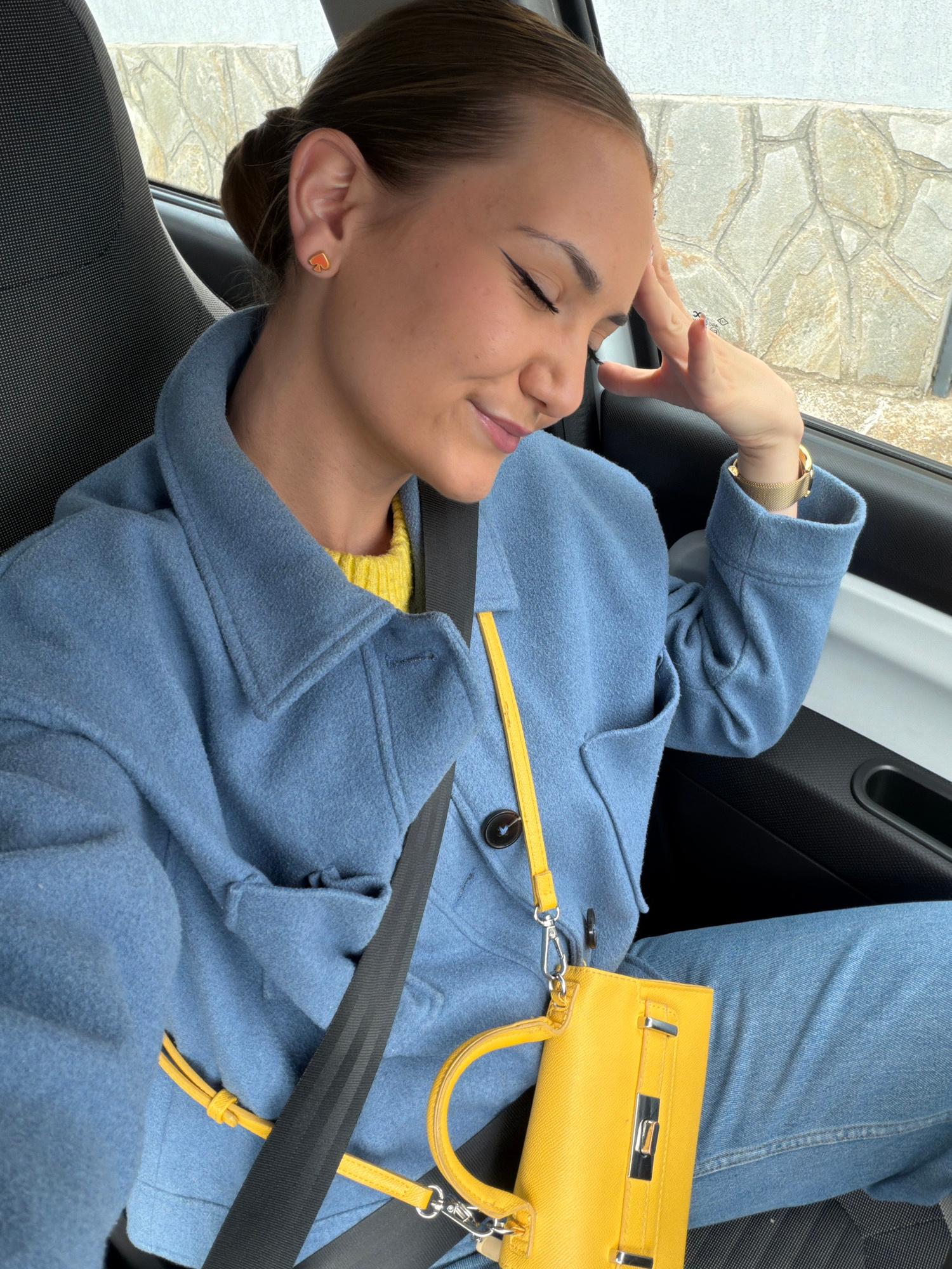 The image shows a woman sitting in a car with a seatbelt fastened. She is wearing a light blue coat over a yellow sweater, and blue jeans. A yellow purse is resting on her lap. The woman is reclining,…read more
