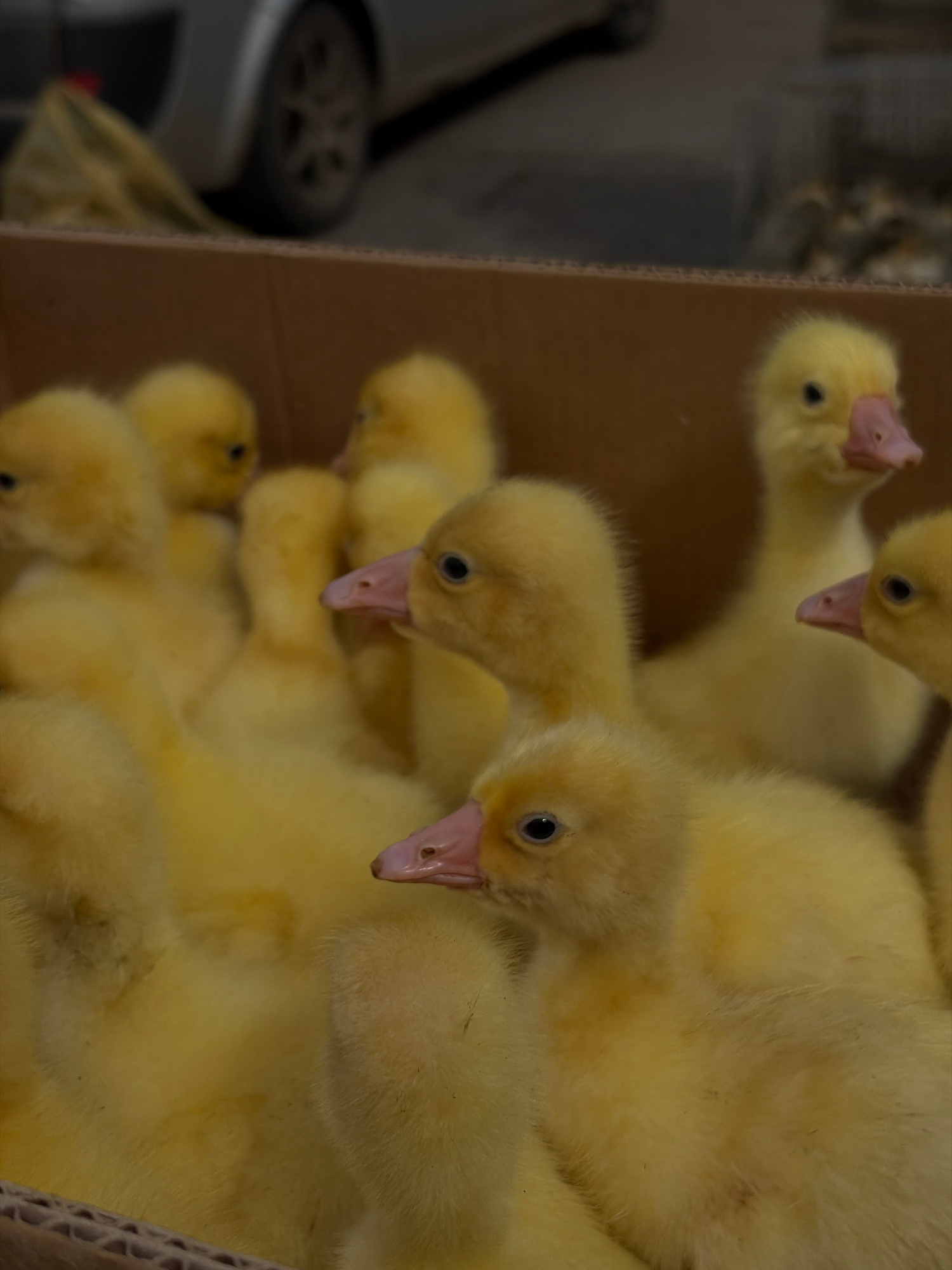 A cardboard box filled with yellow goslings is observed indoors. The camera's vantage point offers a close-up view of the goslings, which appear huddled together. In the background, out of focus, ther…read more