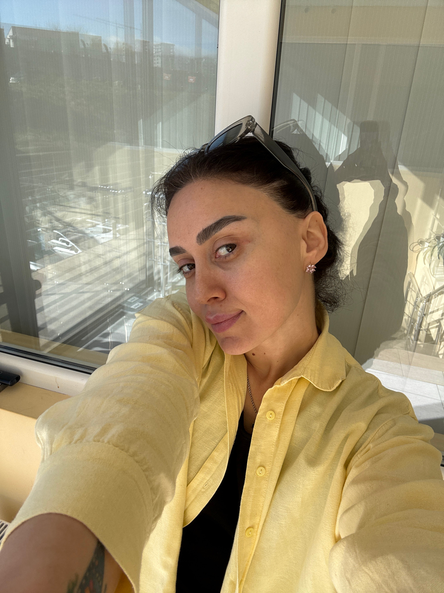 A woman is taking a selfie. She has dark hair, sunglasses resting on her head, and is wearing a light yellow button-down shirt over a black top. She is standing near a window with horizontal blinds. O…read more