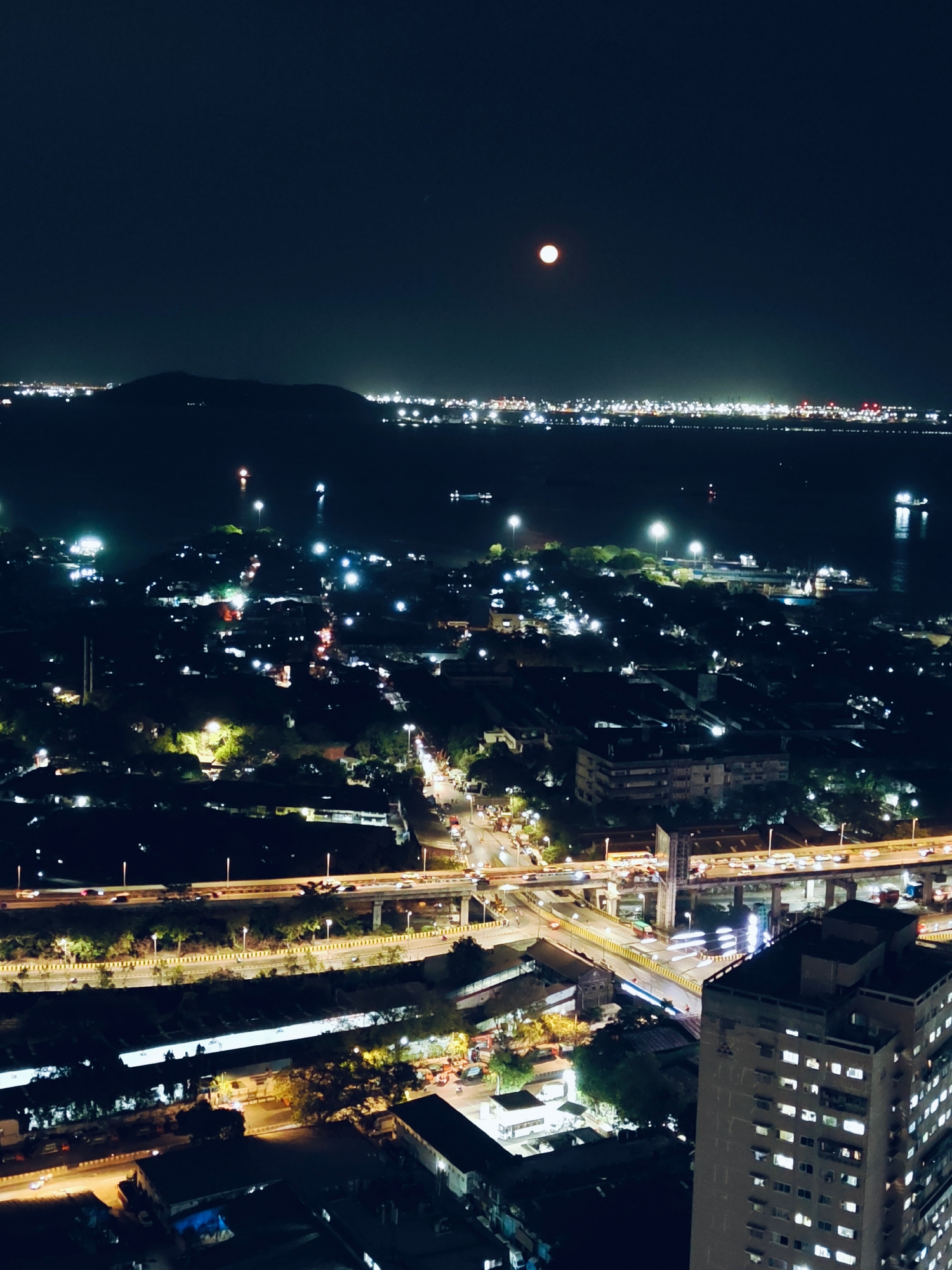 The image depicts a nighttime view from a high vantage point, likely a tall building, overlooking a section of the city of Mumbai, India. A full moon is visible in the sky above the city, providing amβ¦read more