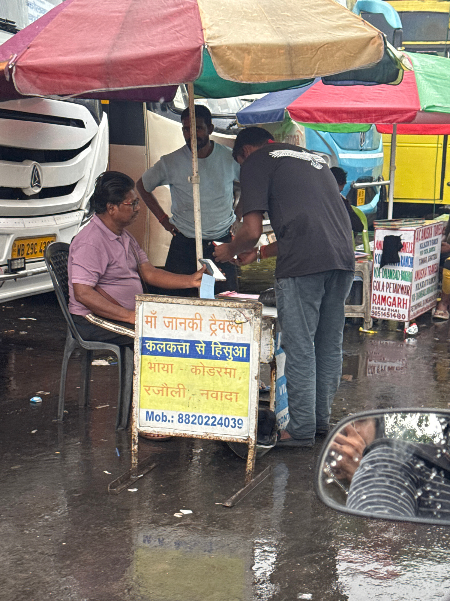 The image depicts a busy urban scene in Kolkata, India, likely during or after a rain shower. People: There are at least three men visible. One is seated on a chair, wearing glasses and a purple shir…read more