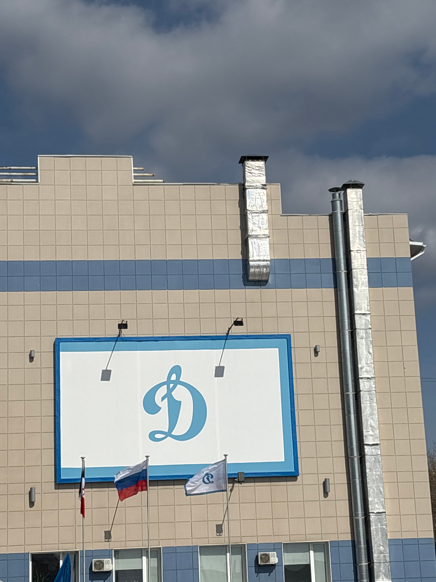 The image depicts a building in Izhevsk, Russia. The building has a tiled facade with alternating columns of light brown and blue tiles. A large rectangular sign with a blue border is attached to the…read more
