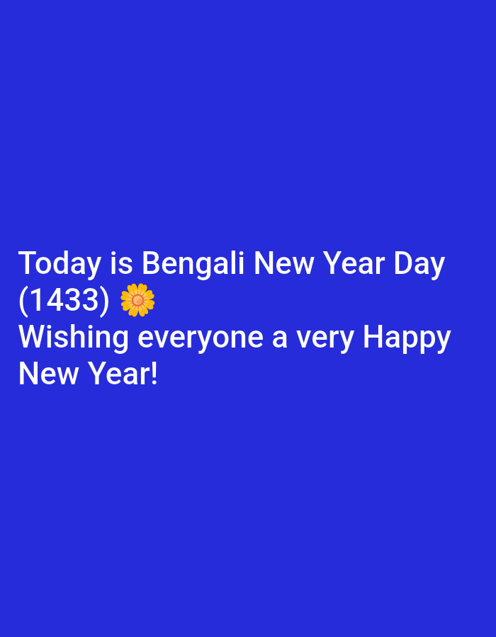 The image is a digital graphic with a blue background. White text is centered on the graphic, which reads "Today is Bengali New Year Day (1433) Wishing everyone a very Happy New Year!". There is a sma…read more