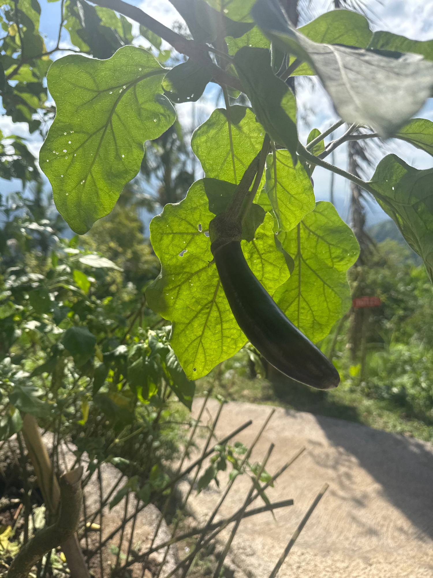 A close-up shot captures an eggplant growing on a plant with large green leaves. The eggplant is elongated and dark in color. The plant is positioned outdoors in an environment with other greenery, su…read more
