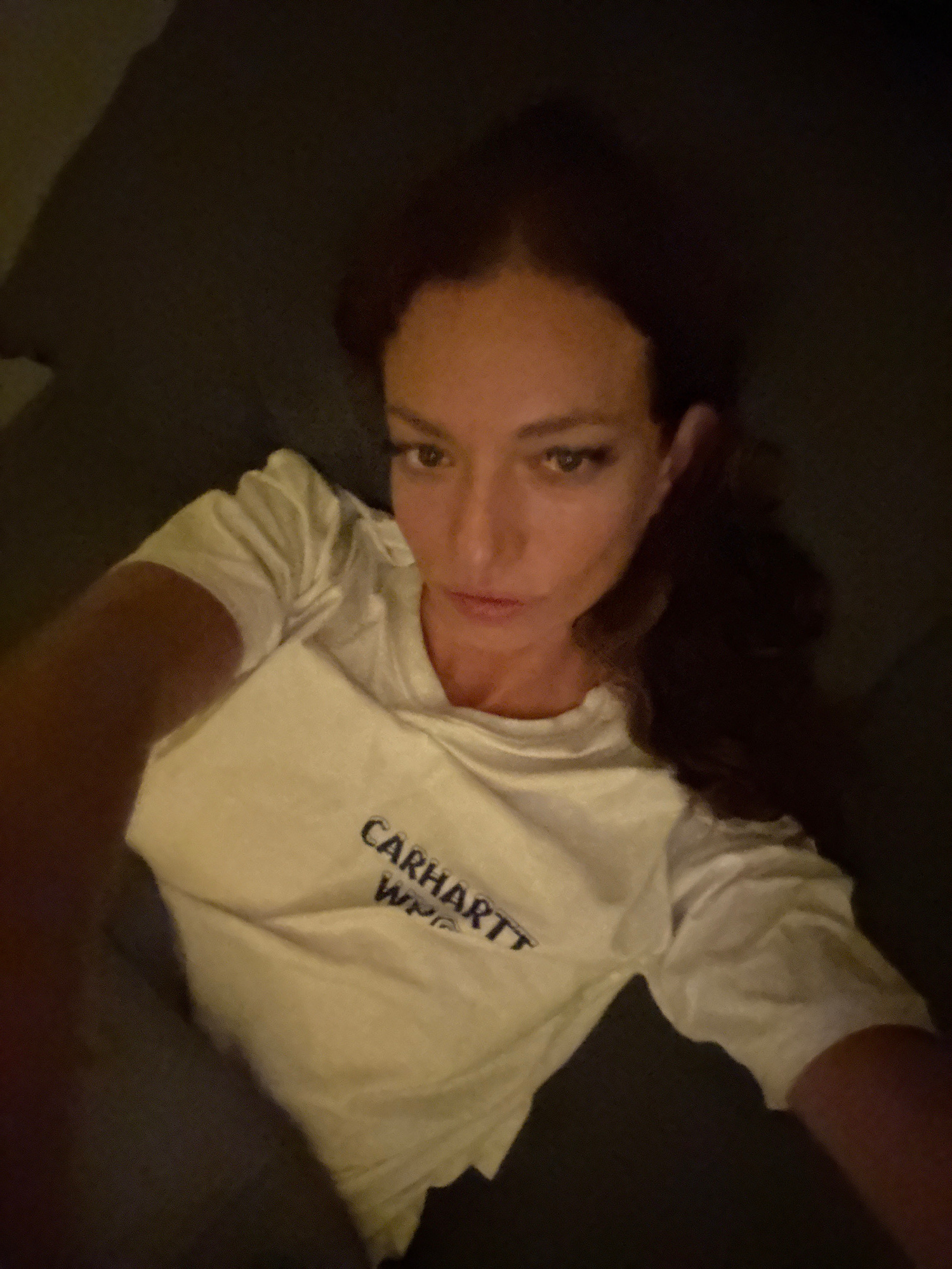 A woman with dark hair is lying down, wearing a white t-shirt with the word "CARHARTT" printed on it. The environment is dimly lit, and she appears to be on a dark gray surface, possibly a couch or be…read more