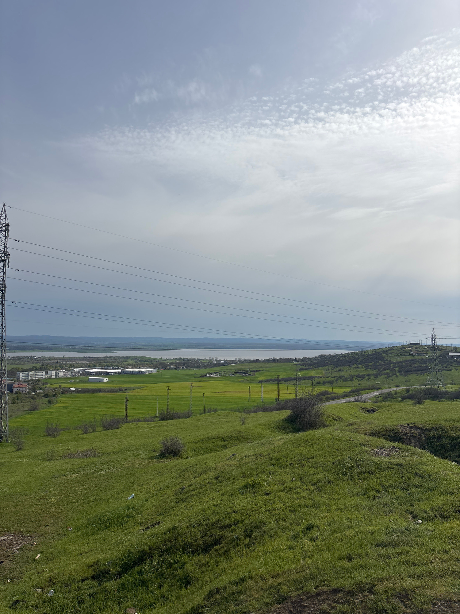 A slightly tilted, long shot depicts a verdant, grassy hillside in Burgas, Bulgaria, overlooking an expanse of water. A row of electrical towers and lines stretches across the frame, bisecting the vie…read more