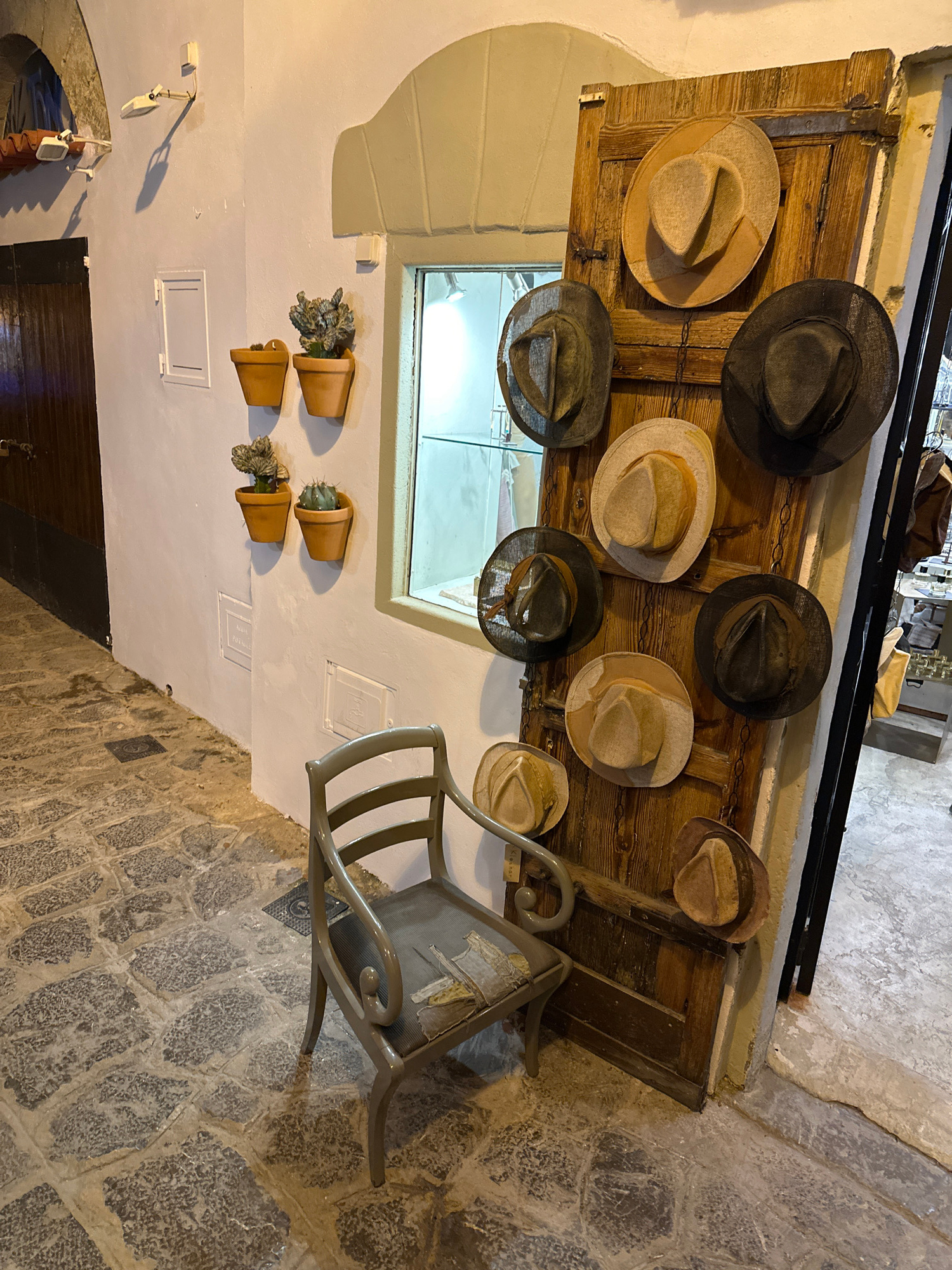 The image captures an outdoor scene, possibly in Eivissa, Spain, given the cobblestone street and architectural details. A wooden board is mounted on a white wall, adorned with an assortment of strawβ¦read more