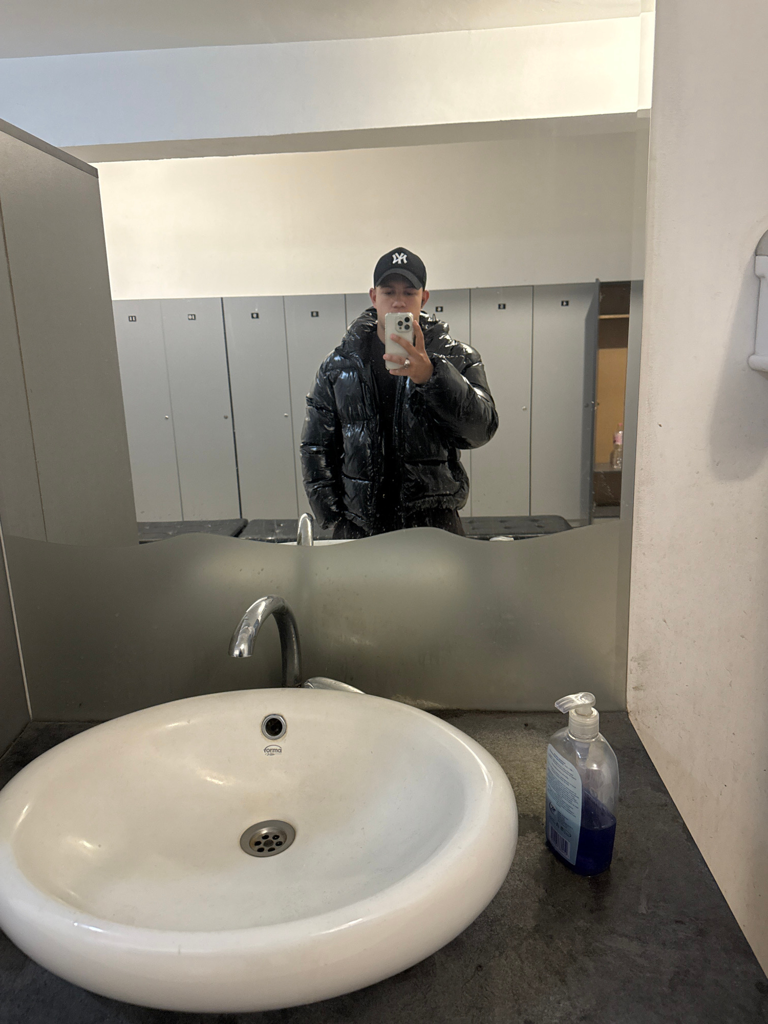 The image shows a person reflected in a bathroom mirror. The person is wearing a black puffy jacket and a baseball cap and is holding a phone up to take a photo. Behind the person in the mirror are a…read more