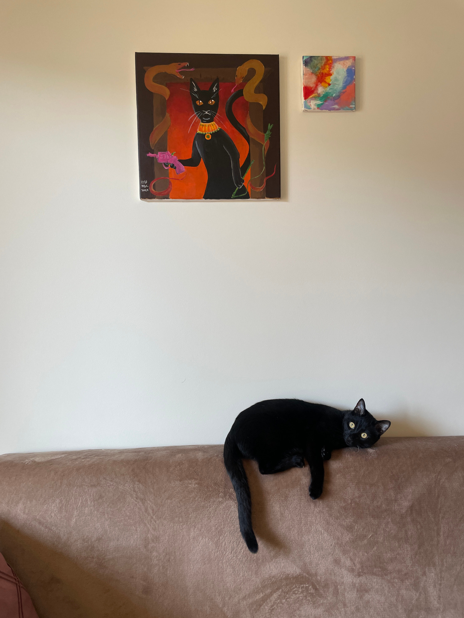 The image shows an interior scene with a light beige wall on the left and part of a brown couch on the right. On the wall, there are two paintings: a smaller one at the top with abstract colorful patt…read more