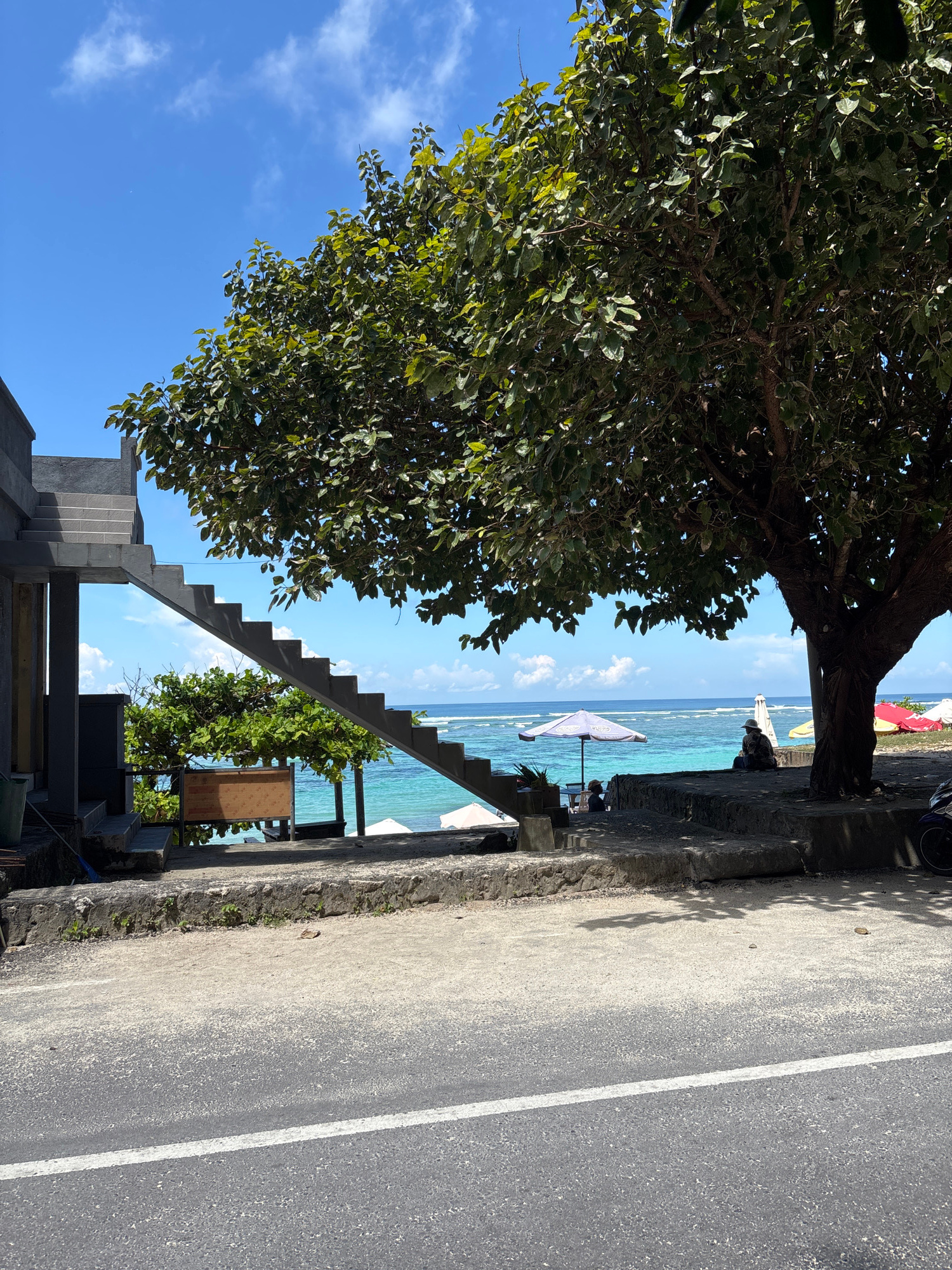 A vertical outdoor shot captures a vibrant coastal scene in Kutuh, Indonesia. The foreground is dominated by lush trees, partially obscuring a bright blue sky with scattered clouds. A set of concrete…read more