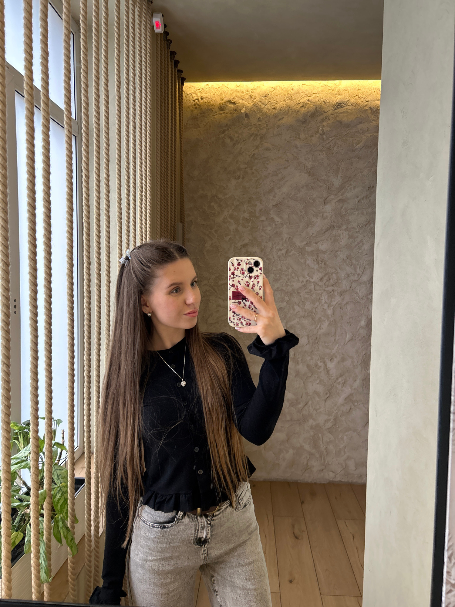 A young woman with long, straight, brown hair, parted down the middle, takes a mirror selfie indoors. She is wearing a black long-sleeved top with ruffled cuffs and light grey high-waisted jeans. Sheβ¦read more