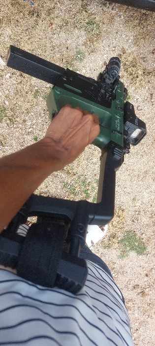 The image displays a first-person, downward perspective of a person holding a Kriss Vector-style submachine gun. A right hand, exhibiting medium-brown skin, firmly grips the firearm's pistol grip. The…read more