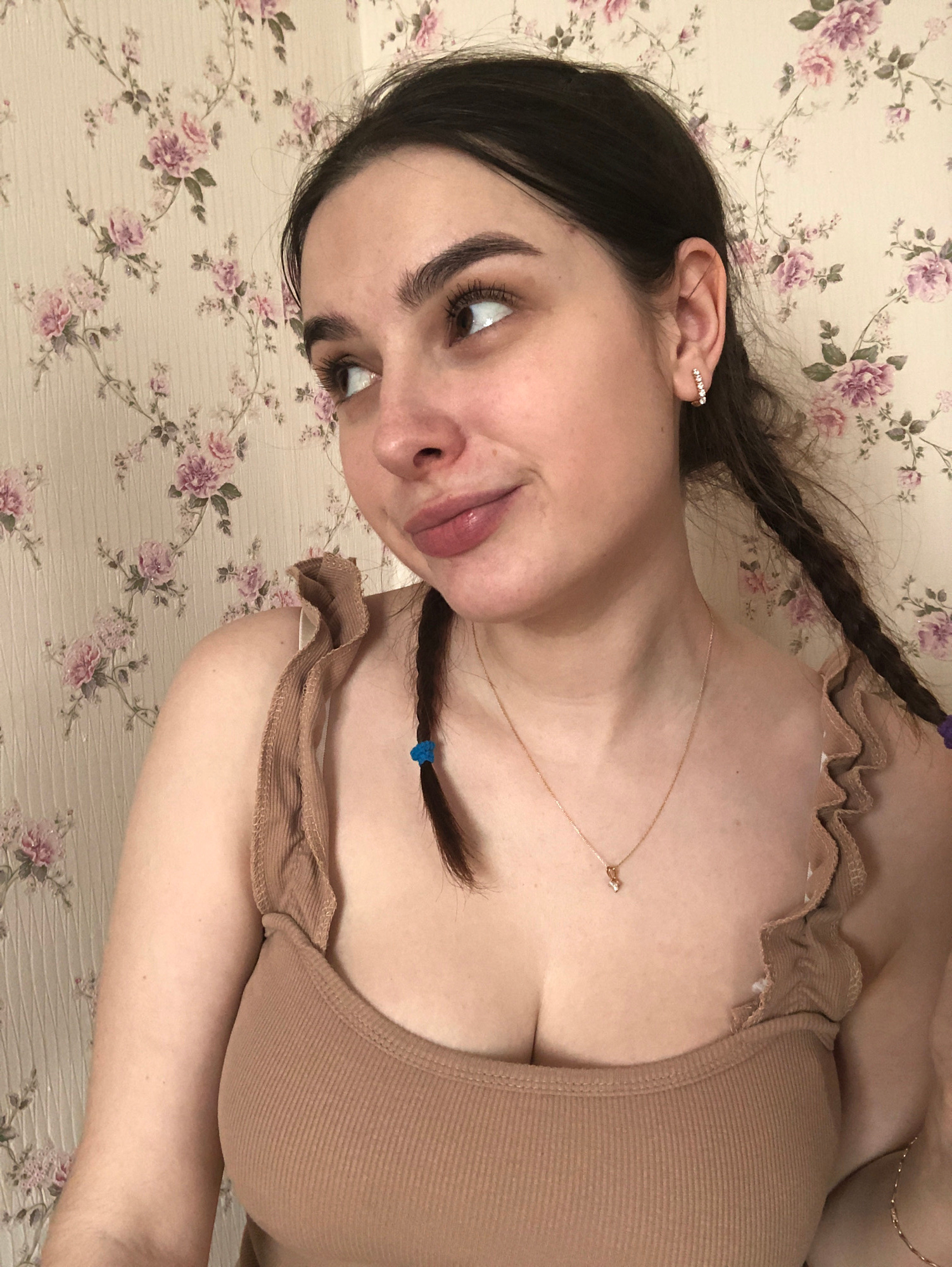The image displays a close-up portrait of a female subject, visible from the mid-chest upwards, situated indoors. The subject is a young adult with dark hair, styled in at least two braids, one visibl…read more