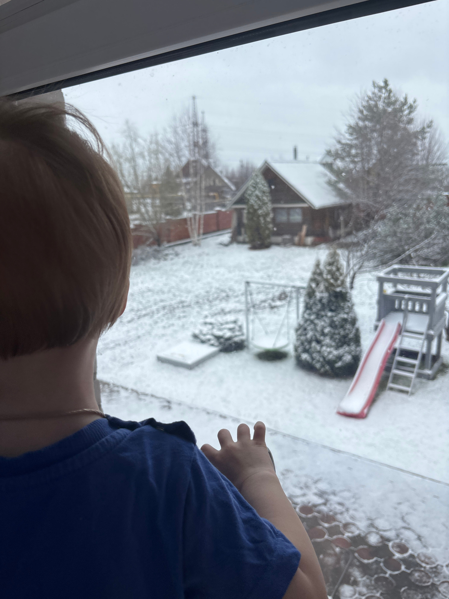 A child is observing a snow-covered landscape through a window. The scene outside includes houses, trees, and a play structure with a red slide, all covered in snow. The child is wearing a blue shirt…read more