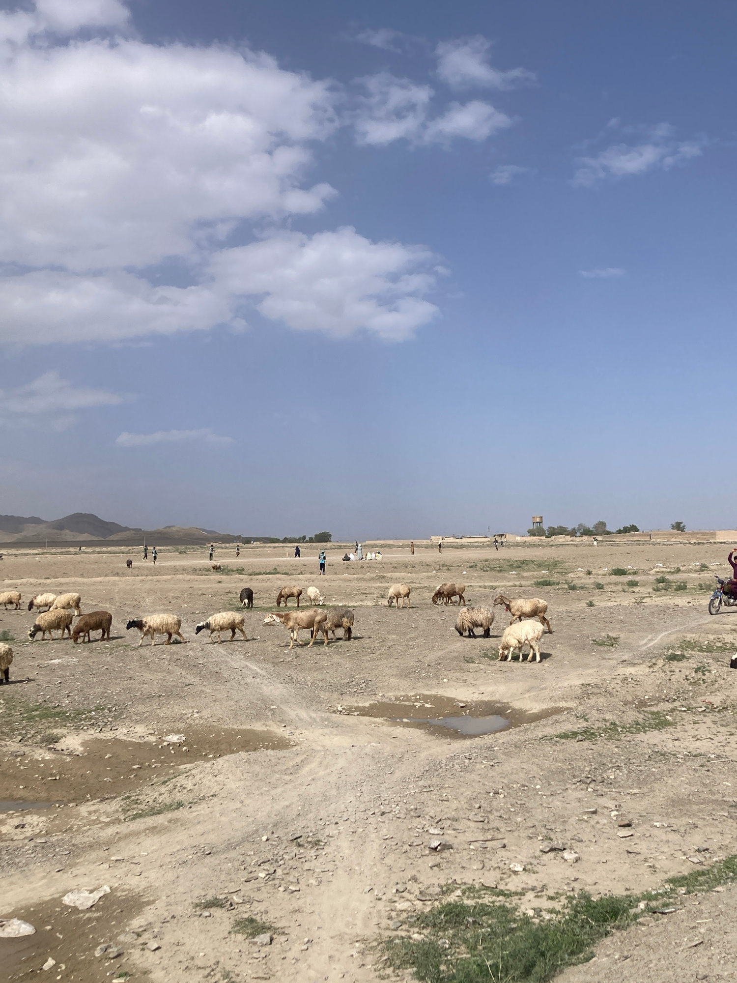 The image shows a flock of sheep moving across a dry, arid landscape, likely a rural area. In the background, there are mountains and what appear to be structures, possibly a small village or settleme…read more