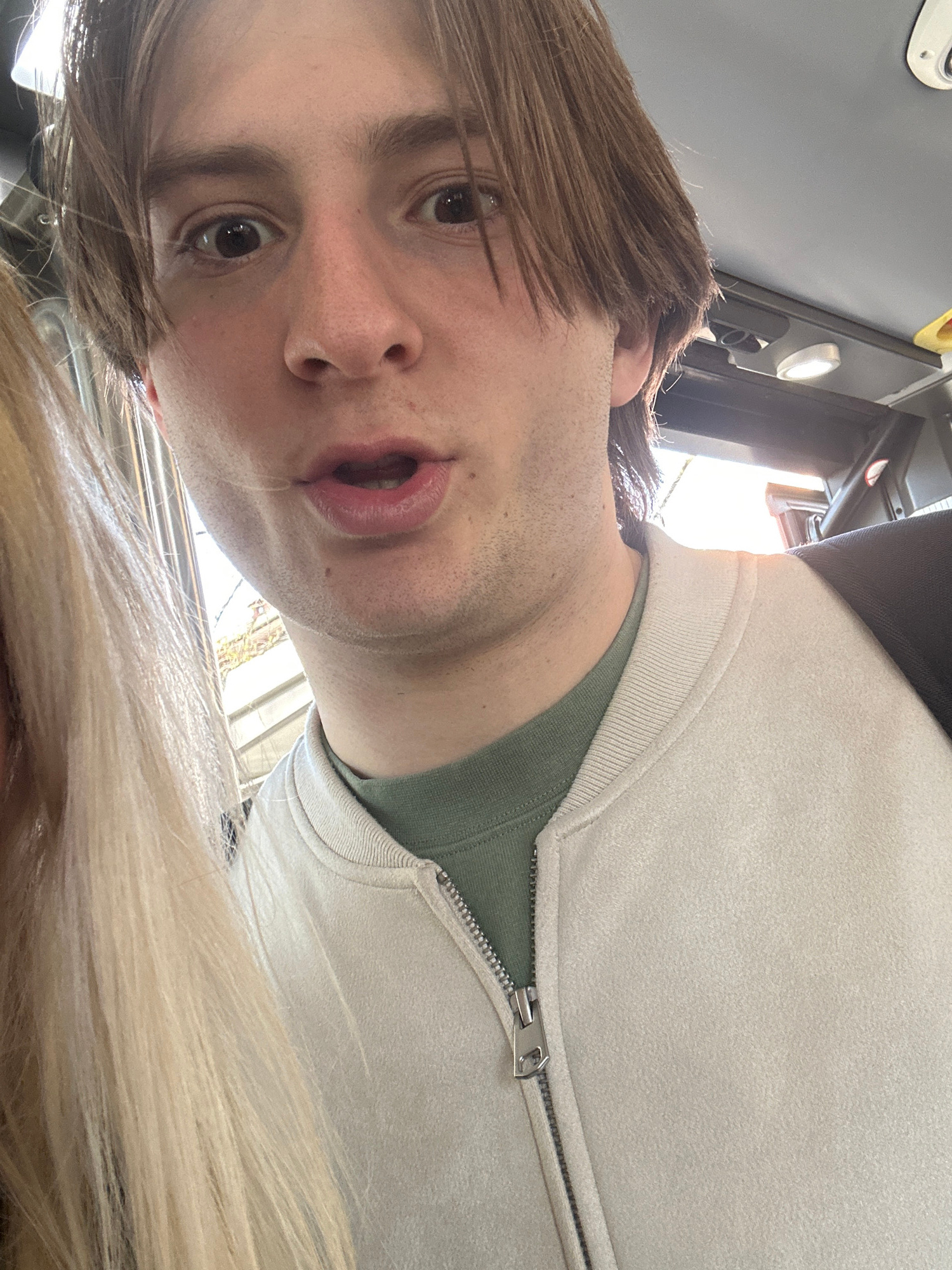 The image displays a young Caucasian male captured in a selfie within a public transport vehicle in Milan, Italy. The male subject, estimated to be 20-30 years old, has shoulder-length brown hair and…read more
