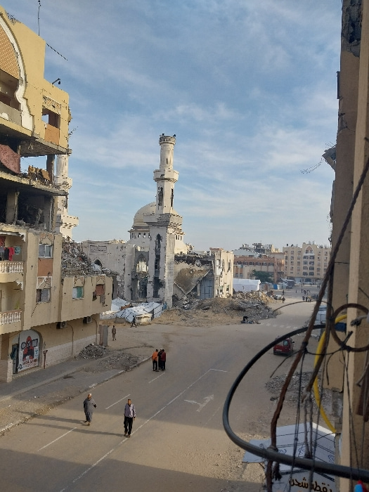 An elevated street view depicts a scene of extensive urban destruction in Khan Yunis, Palestinian Territory, under a partly cloudy sky. In the mid-ground, the Great Mosque of Khan Yunis appears severe…read more