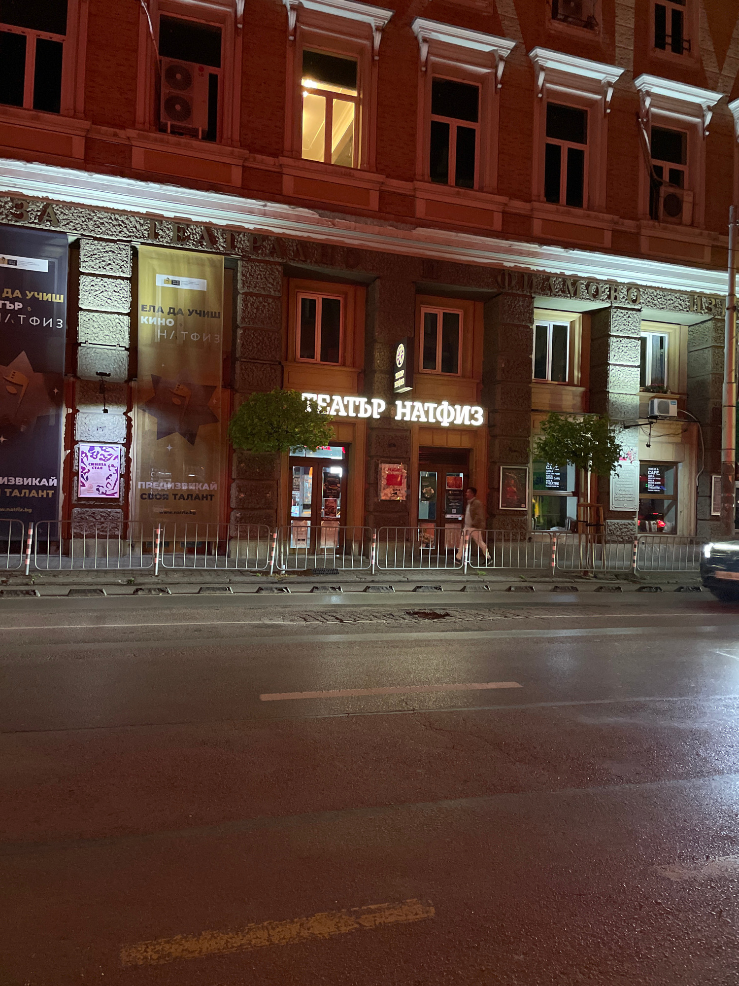The image depicts the exterior of the National Academy for Theatre and Film Arts (NATFIZ) in Sofia, Bulgaria, at night. The building has a classical architectural style with multiple stories and windo…read more