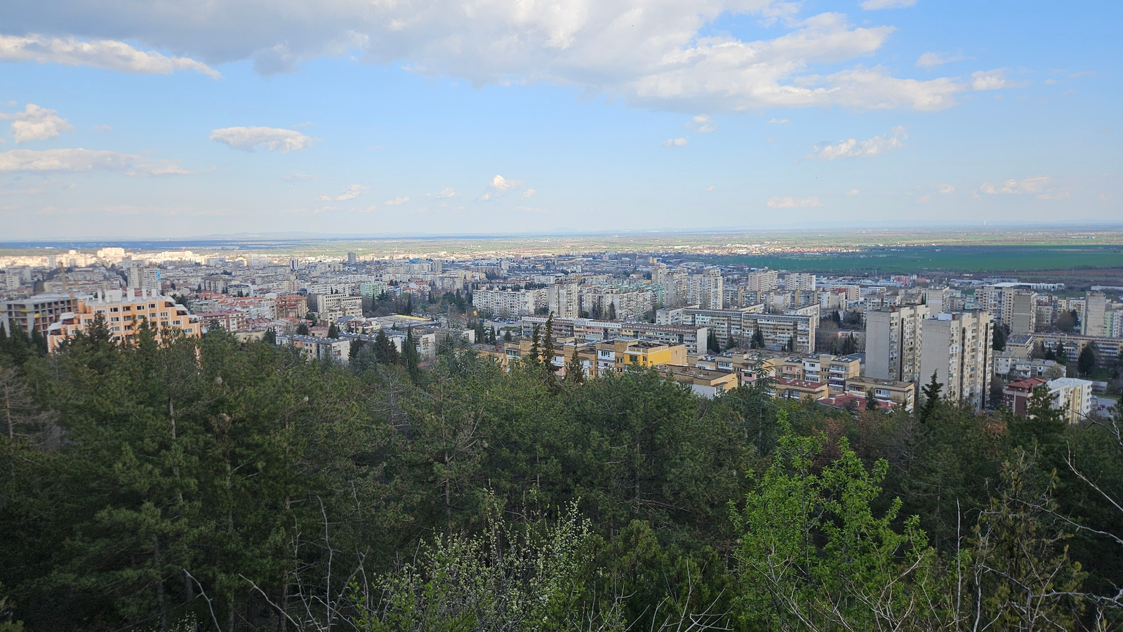 The image depicts a wide-angle, elevated view of Stara Zagora, Bulgaria. The foreground is dominated by a dense cluster of evergreen trees and shrubs. The city stretches out in the middle ground, char…read more