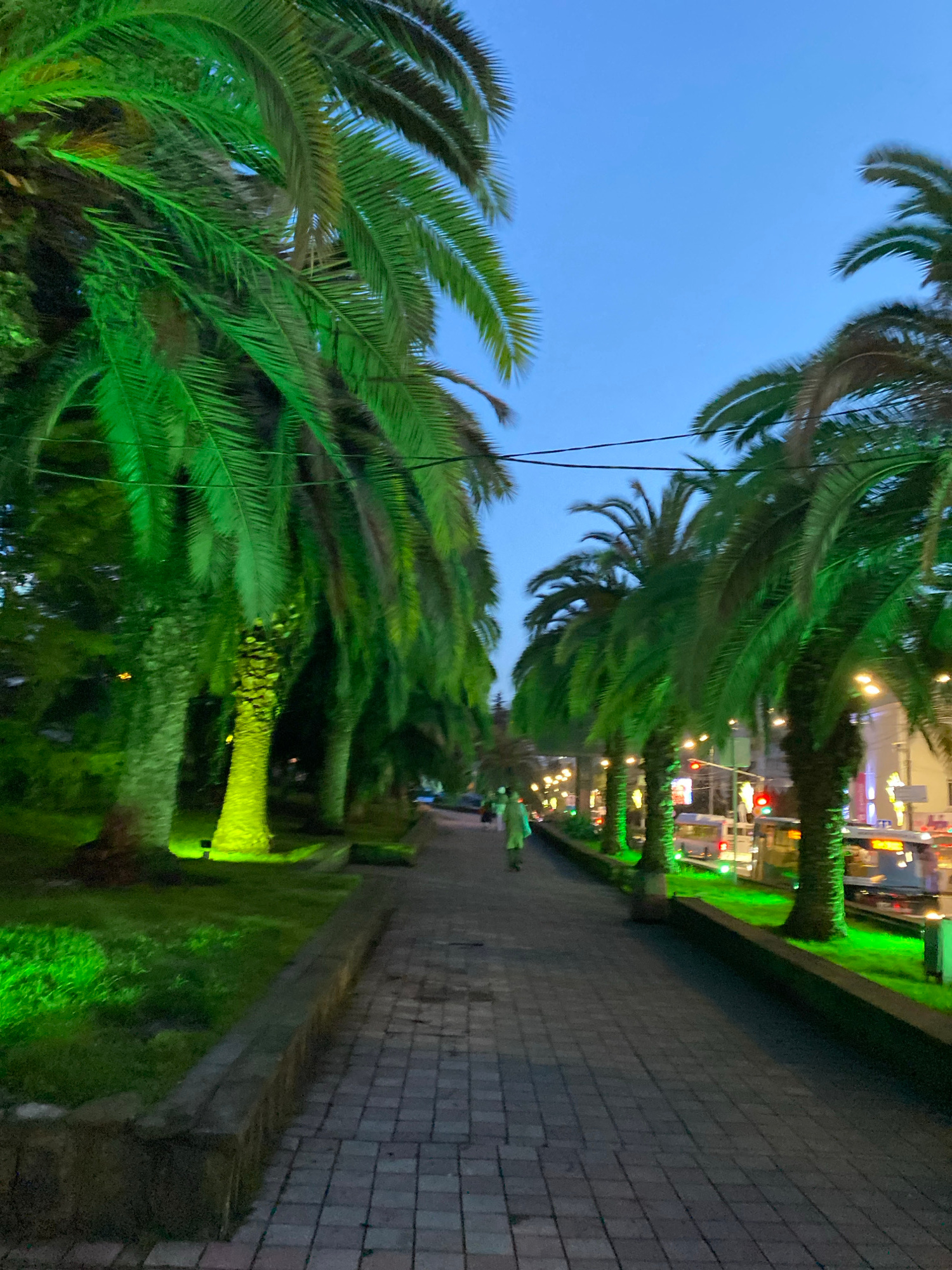 The image depicts a pathway lined with palm trees in Sochi, Russia, illuminated by green lights. The walkway is paved with gray bricks and runs alongside a raised grassy area, which is also lit with g…read more