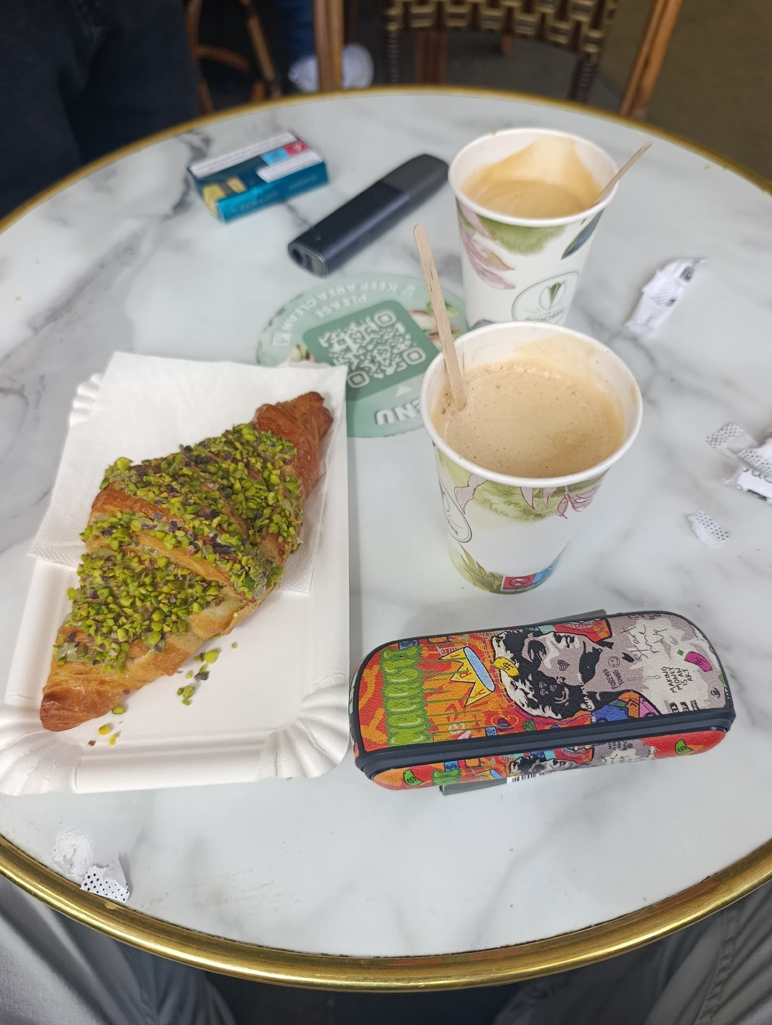 The scene depicts a marble table with a gold rim, likely in a Parisian cafe in France. A croissant topped with chopped pistachios sits on a white paper plate. Two paper cups containing coffee with foa…read more