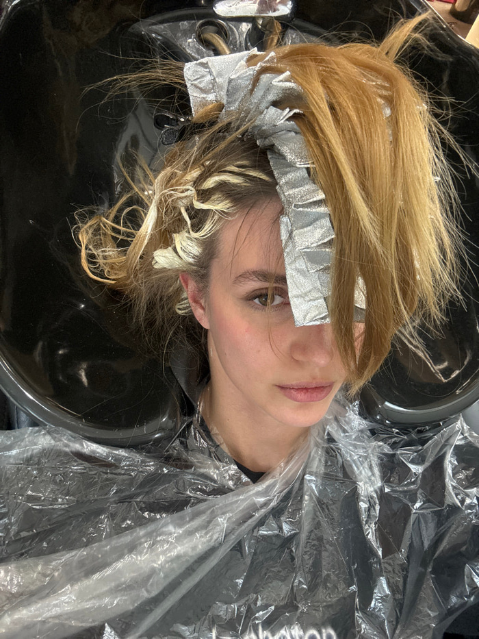 A female individual is depicted in an indoor hair salon, positioned with her head in a black hair wash basin. Her light brown and blonde hair is undergoing a chemical treatment, with multiple sections…read more