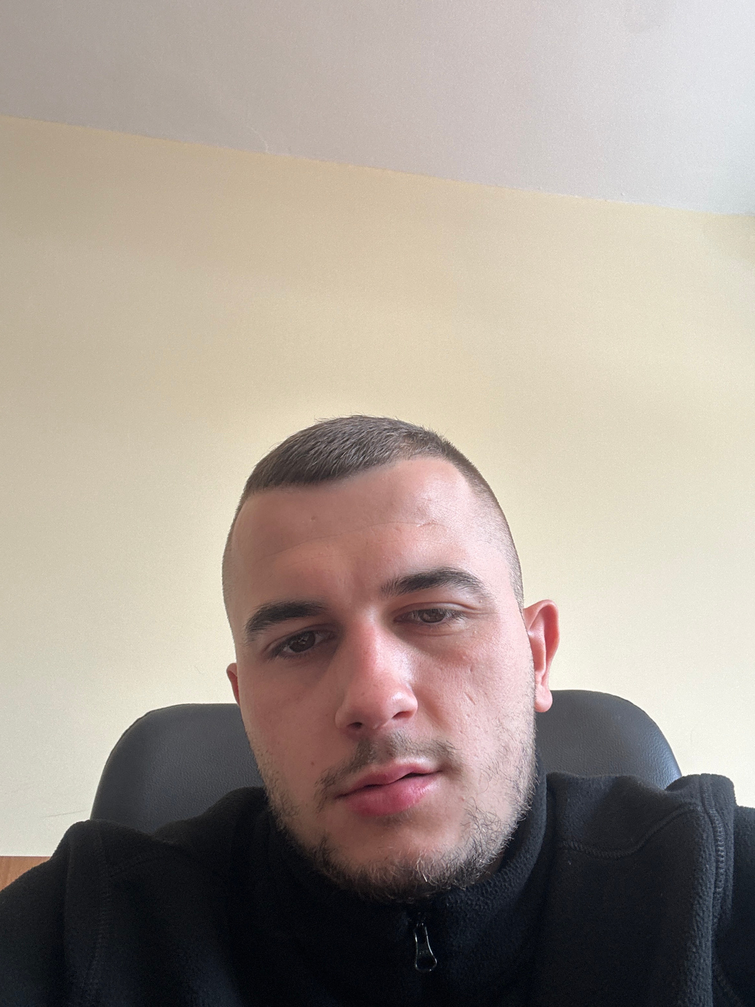 A close-up, slightly rotated image shows a man with a buzz cut haircut and light stubble. He is wearing a black fleece jacket and seated in a black chair. The background consists of a plain, light yel…read more