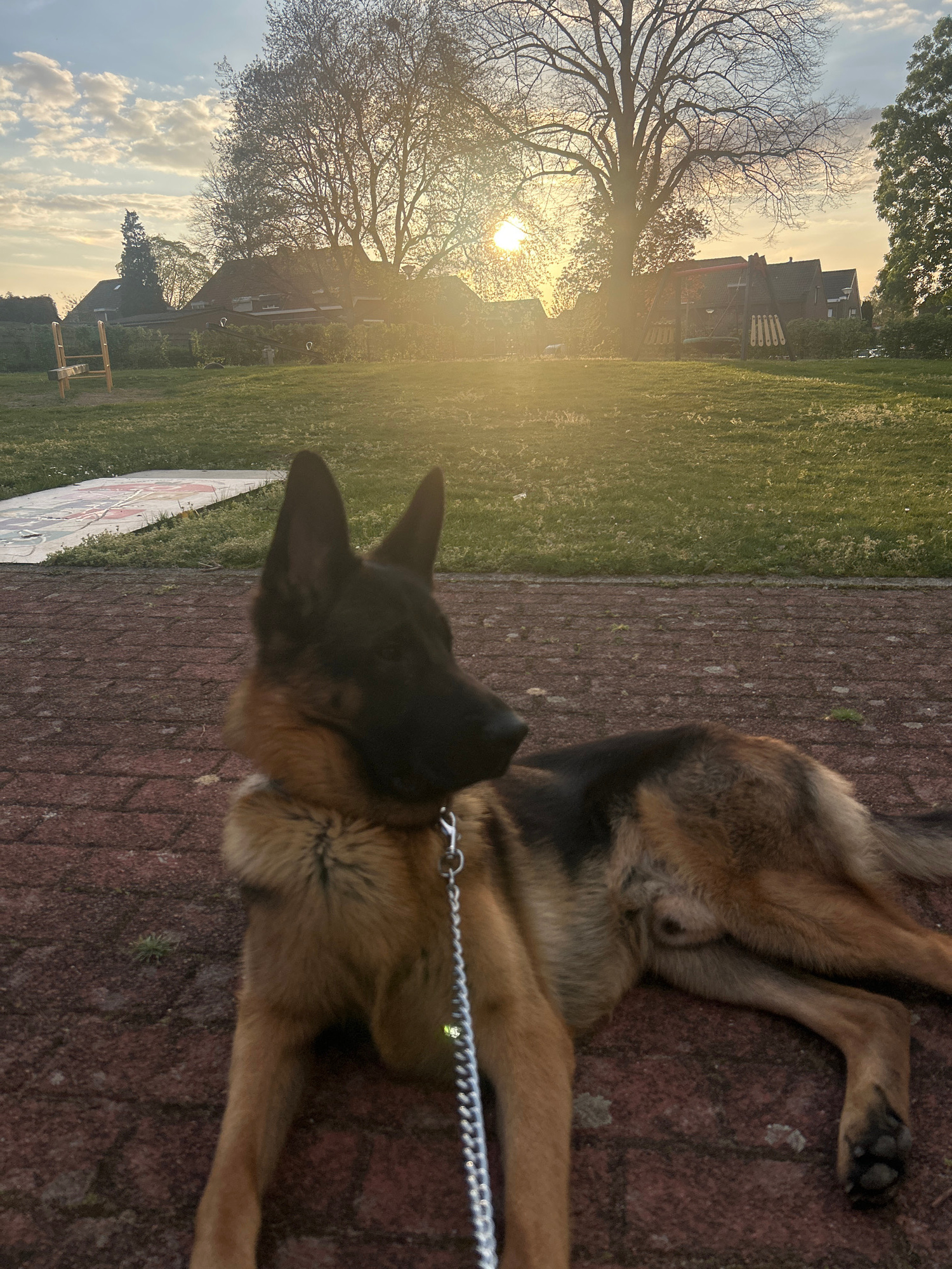 The image, oriented in portrait, captures a German Shepherd dog lying relaxed on a paved surface during what appears to be either sunset or sunrise. The dog, with a distinctive brown and black coat an…read more