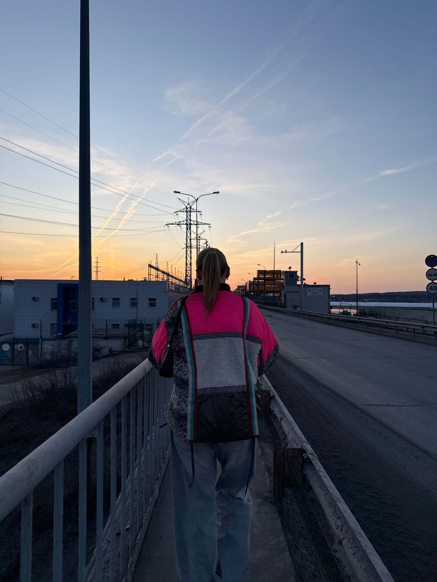 A person is leaning over the railing of a bridge overlooking the city of Chaikovsky, Russia, during a sunset. The person is wearing a pink, grey, and black jacket with light grey pants. The bridge has…read more