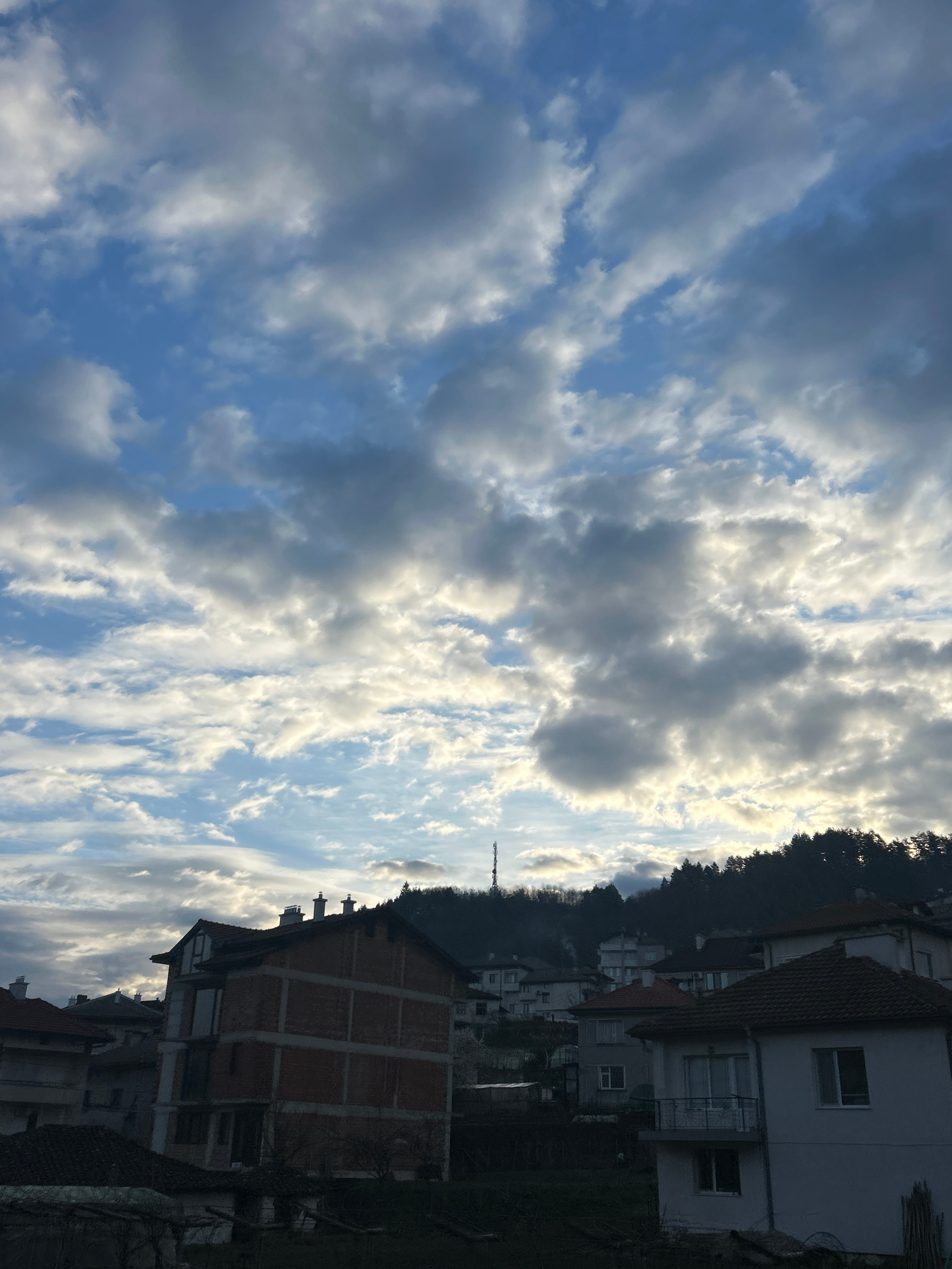 The image shows a view of Zlatograd, Bulgaria, with a focus on the sky and some buildings. The sky is mostly blue with many white and grey clouds. A tower can be seen extending into the sky, likely a…read more