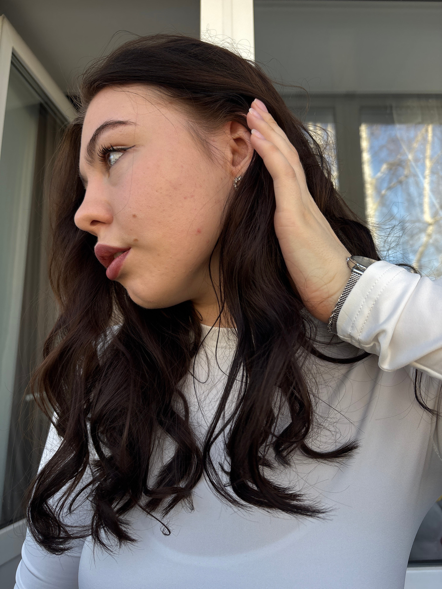A close-up, right-profile shot of a female in the city of Perm, Russia. She has long, wavy dark brown hair and fair skin with minor blemishes. Her right eye features dark eyeliner, and her lips are pa…read more