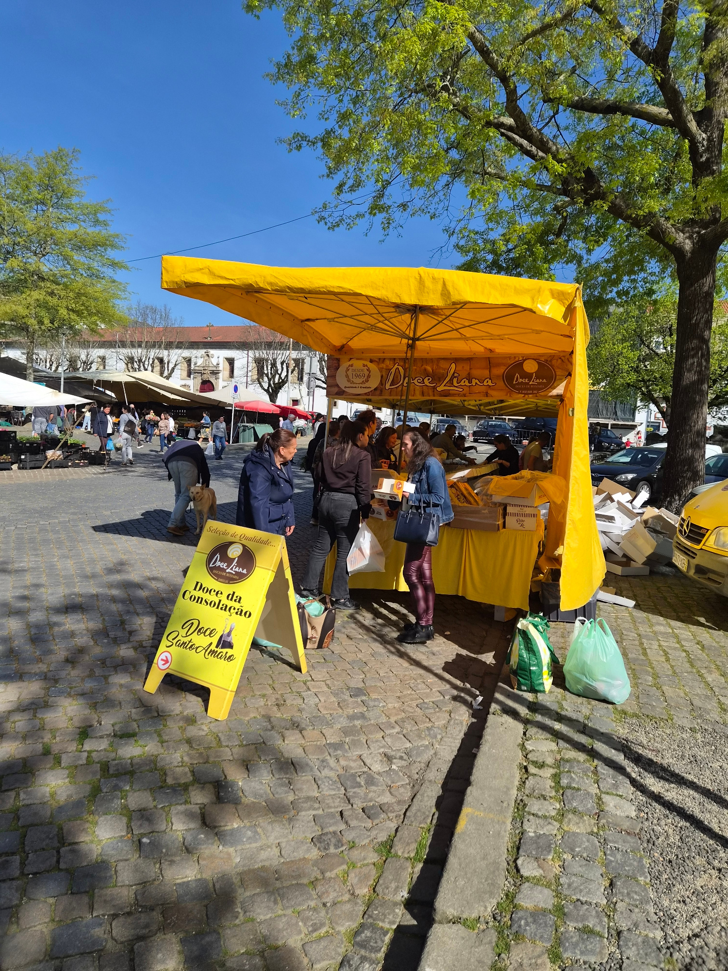 The image captures a bustling outdoor market scene, likely in the city of Barcelos, Portugal, given the prominent signage for "Doce da Consolação," a traditional sweet from the nearby town of Santo Am…read more