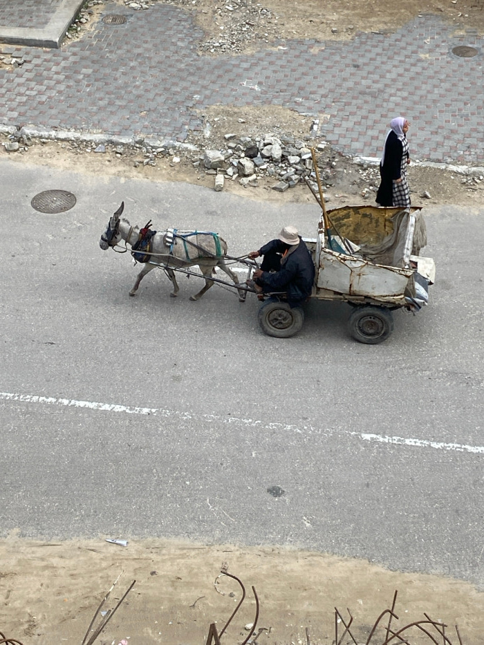 An overhead view depicts a street scene in Khan Yunis, Palestinian Territory. A light grey donkey, fitted with a multi-strap harness, pulls a two-wheeled, dilapidated cart across an asphalt road from…read more
