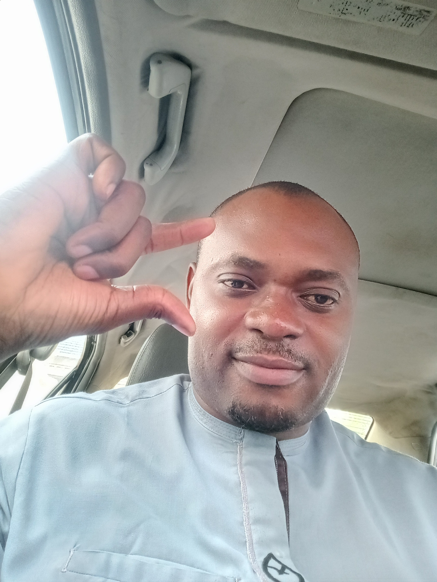 A medium shot of a man with dark skin and a shaved head, wearing a light blue tunic. He is in a car, holding his left hand up with his thumb and index finger forming a small "L" shape. The car's inter…read more