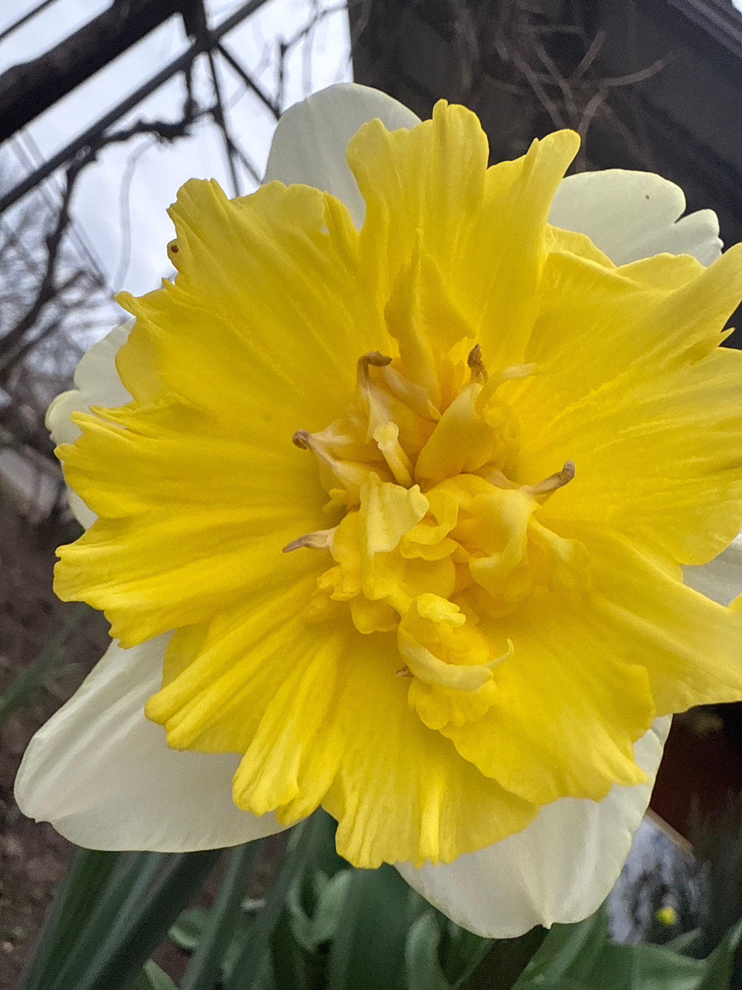 A close-up of a daffodil with white and yellow petals. The daffodil has many layers of petals and is in full bloom. The petals are a vibrant yellow in the center and transition to a creamy white on th…read more